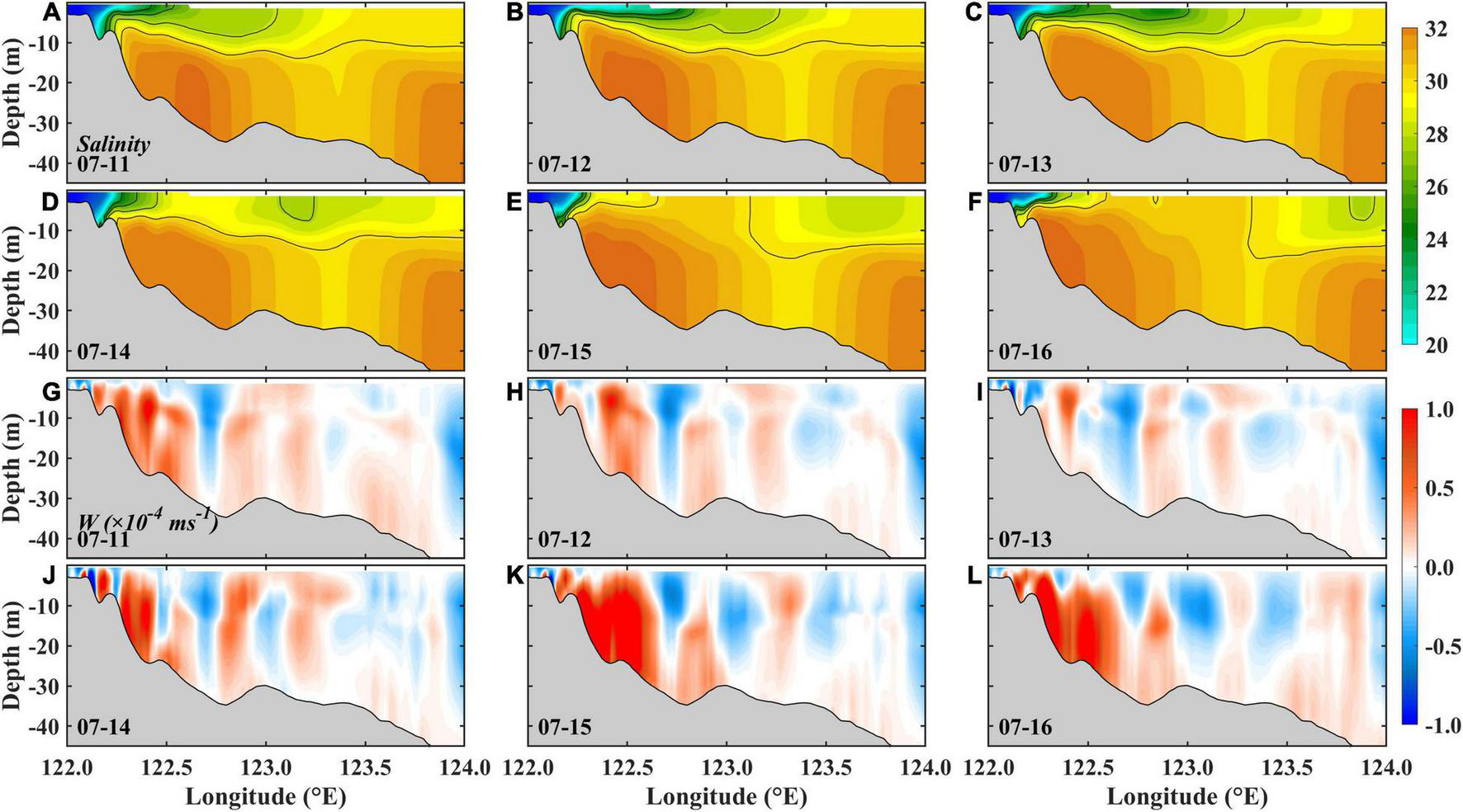 Figure 7. (A–F) The daily-averaged salinity (black lines indicate 24, 26, 28, and 30 psu) and (G–L) vertical velocity (unit: ×10–4ms–1) along the cross-section A from July 11 to 16, 2006.
