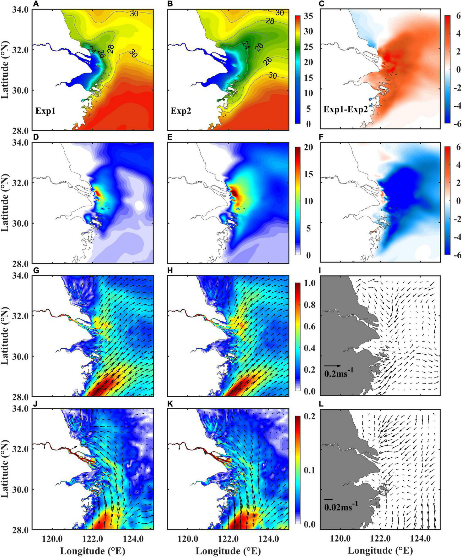Figure 8. The (A–C) surface salinity, (D–F) difference between the bottom and surface salinity (bottom minus surface), (G–I) surface current, and (J–L) bottom current (unit: ms–1) averaged from July 11 to 19 in (A,D,G,J) Exp1 (CR), (B,E,H,K) Exp2 (NoWave), and (C,F,I,L) Exp1–Exp2. Color indicates magnitude and arrows for direction.