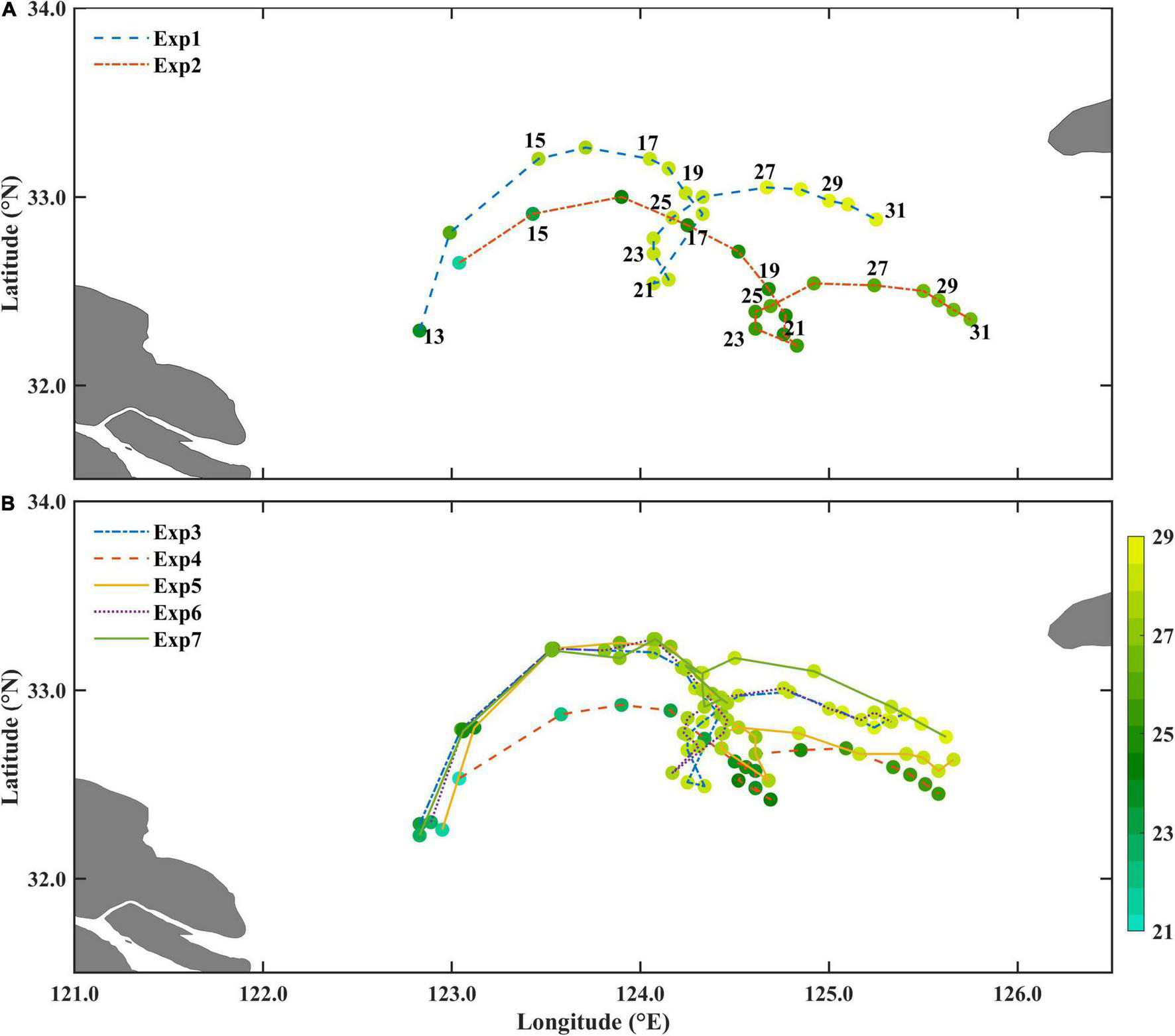 Figure 11. The trajectory of the LSW center since the detachment in (A) Exp1 (CR) and Exp2 (NoWave), and (B) Exp3 (NoCWCBS), Exp4 (NoFormDrag), Exp5 (NoWDinTKE), Exp6 (NoWRS), and Exp7 (NoCARWE), respectively. Color circles indicate the core salinity of the LSW and the numbers indicate the day of July.