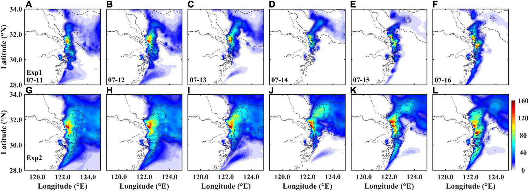 The daily averaged SSS in the control run shows two LSW detachment events started on July 13 and July 28, respectively, when the 24 psu (25 psu for the second event) isohaline closed and just disconnected with the river plume front. Xuan et al. (2012) also confirmed these two events happened in July, but they used the date of “complete detachment,” which is usually some days later after the detachment begins. As the first event was more obvious and this isolated LSW existed longer than the second one, in this study, we will focus on the first detachment event from July 11 to July 19. The wind turned southerly on July 10 and kept increasing until July 15, and then decreased gradually until July 19 (Figure 5A). Correspondingly, the wave propagated from south to north, and the Hs increased from July 13 to 15 but then decreased.