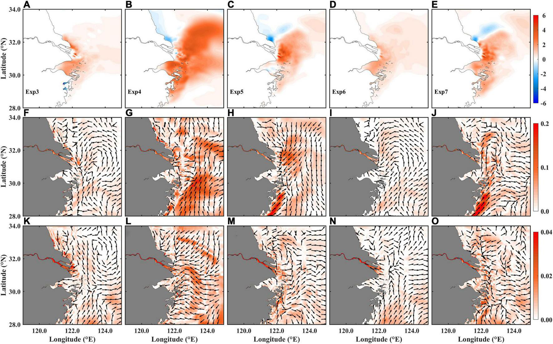The CWCBS (Exp1-Exp3) generates northward currents along the coast and a weakly anticlockwise circulation off the CRE (Figure 13F). The largest CWCBS-induced surface flow is about 0.07 ms–1 along the Jiangsu coast. The form drag (Exp1–Exp4) can generate the largest surface flow (0.14 ms–1 in maximum), which flows northward to northeastward (Figure 13G). The wave dissipation in the TKE equation (Exp1–Exp5) can induce southward surface flow with a magnitude of 0.10 ms–1, which is basically opposite to that induced by the form drag (Figure 13H). The WRS (Exp1–Exp6) also generates weak surface flow in the study area. Similar to the flow induced by the CWCBS, the WRS can generate an anticlockwise circulation off the CRE (Figure 13I). The CARWE (Exp1–Exp7) generates northeastward surface flow along the Zhejiang coast but southward flow along the Jiangsu coast (Figure 13J). There is also a northward surface flow from the Hangzhou Bay to the CRE along 122°E until 33°N, which turns sharply to the southward on 123°E. All the wave–current interaction processes can enhance the TWC inshore branch. The CWCBS, the wave dissipation on turbulence, and the WRS work together to weaken the northeastward surface flow along the CDW pathway (Figure 8I), which in turn is enhanced by the form drag and the CARWE.