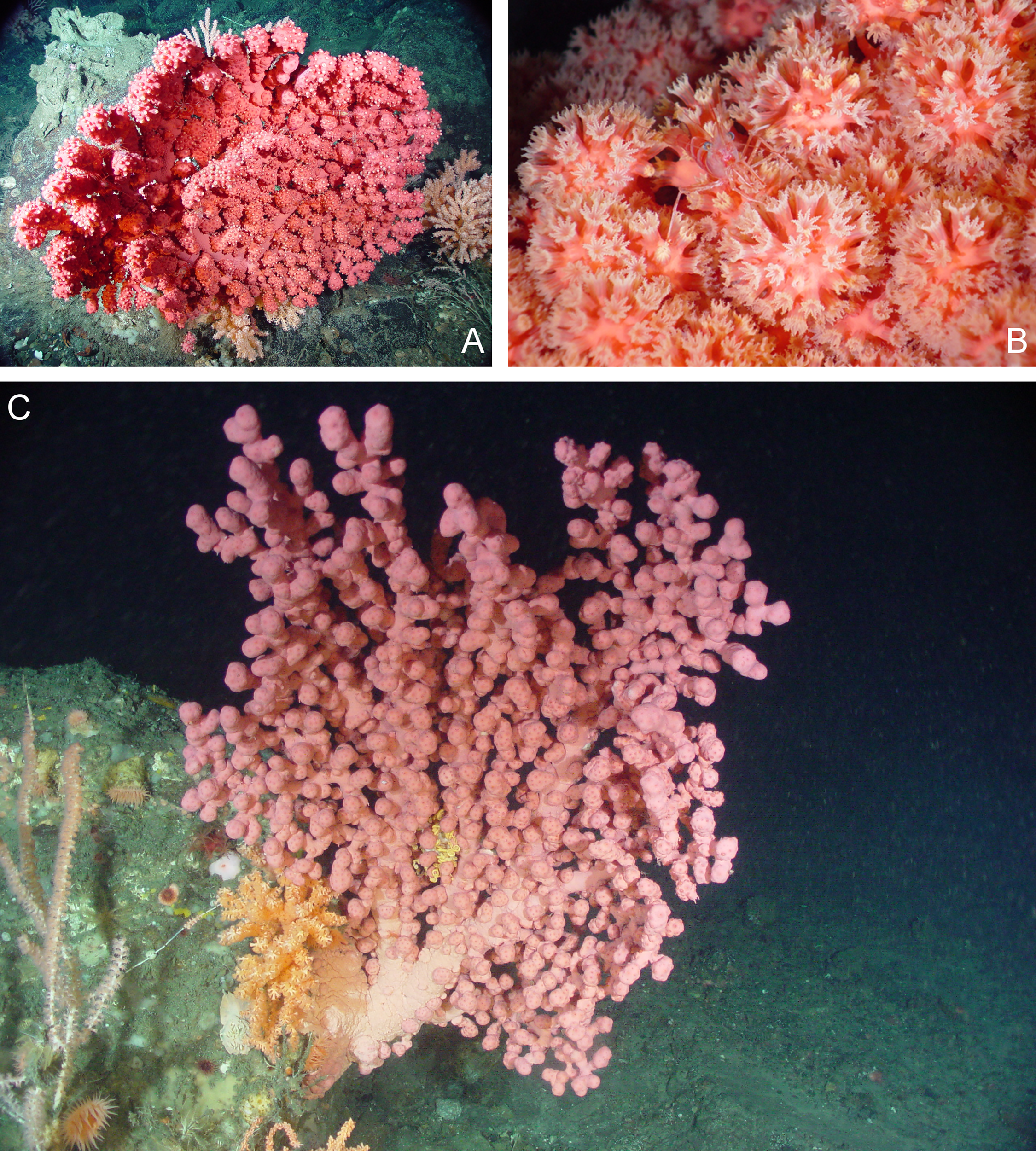In situ images of Paragorgia arborea from the Northeast Channel Coral Conservation Area. (A) Intact colony growing on bedrock; (B) Close up of polyps open for feeding; (C) Intact colony growing on a boulder.