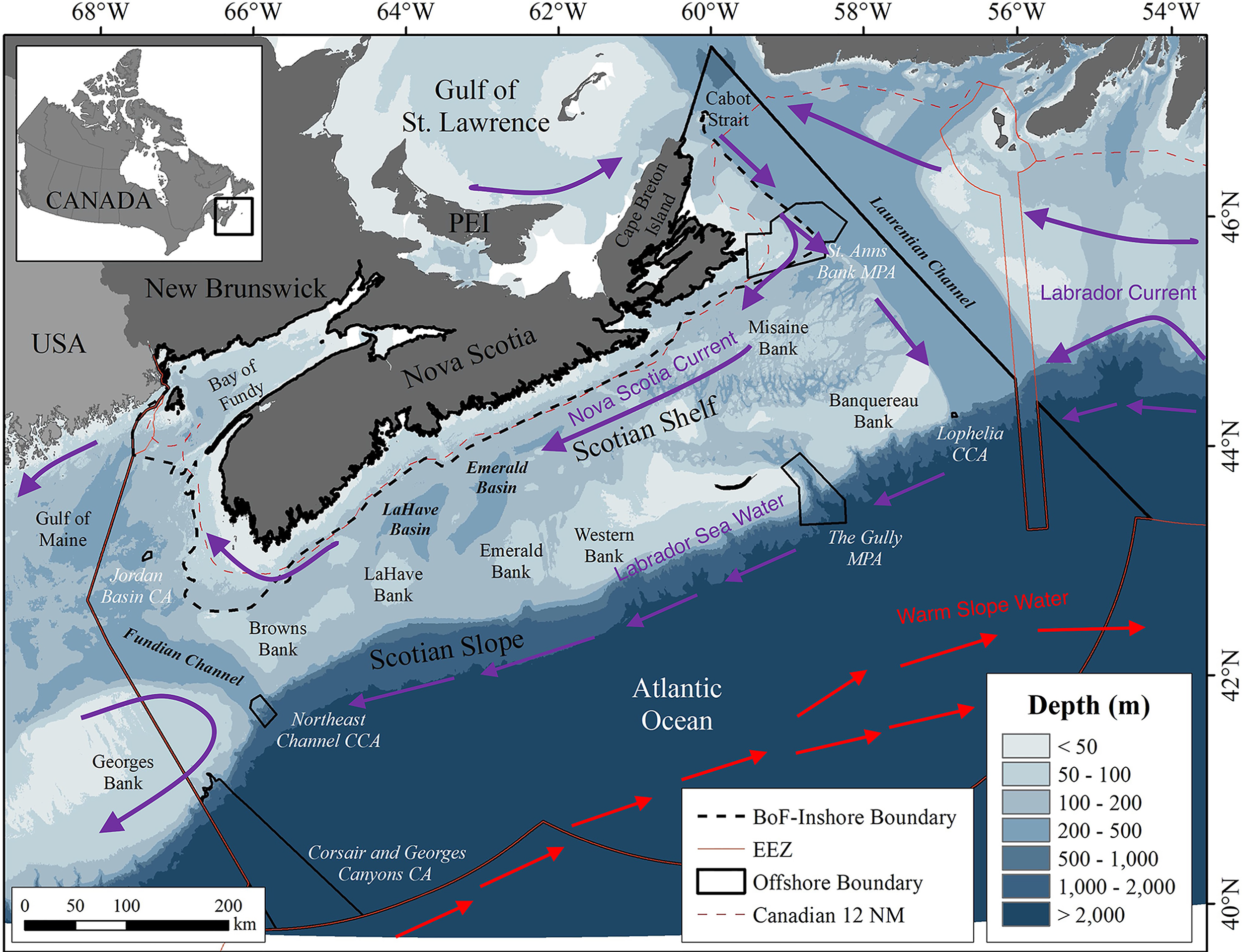 The waters of the continental shelf originate in the Gulf of St. Lawrence, where a very cold, low-salinity Cold Intermediate Layer and, in summer, a warm surface layer, cross the shallow banks of the eastern Scotian Shelf (Han and Loder, 2003), flowing southwestwards with the Nova Scotia Current (Figure 2). These waters over the Scotian Shelf flow into the Gulf of Maine, which also receives a deep inflow of WSW through the Northeast Channel (Townsend et al., 2015). Another branch of the Gulf of St. Lawrence outflow merges with cold, low salinity water from the north carried by the Labrador Current flowing southwestwards along the edge of the Scotian Shelf as a Shelf-Break Current (Han et al., 1999). This cold, less saline Labrador Sea Water is carried along the upper continental slope off Nova Scotia (Figure 2).