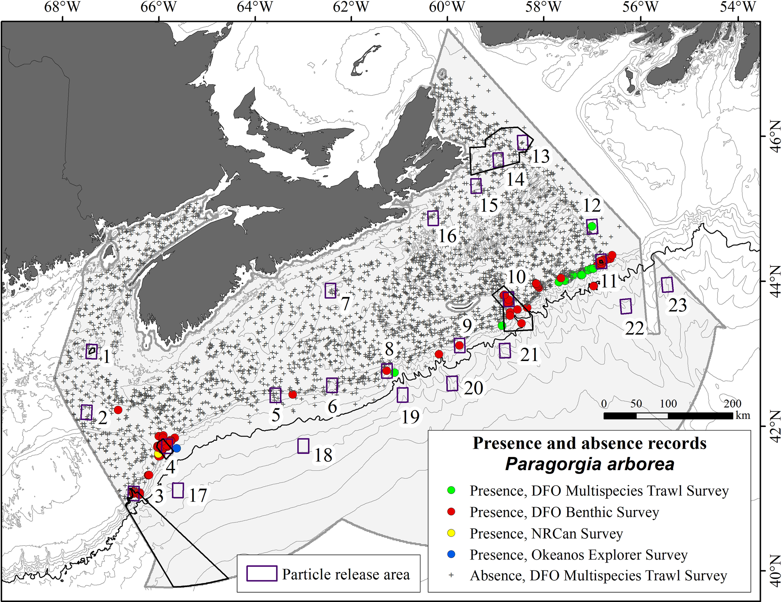 In each experiment, model particles were seeded in 23 ‘source boxes’, each 0.1° × 0.1° in extent, with some of them selected within the known or predicted distributions of P. arborea, and others positioned where needed to examine various connectivity hypotheses (Figure 3 and Supplementary Table 4). Source Boxes 1, 3, 4, 10, 11, and 13 and 14, were placed in, respectively, the Jordan Basin, Corsair and Georges Canyons, and Northeast Channel Coral Conservation Areas, the Gully MPA, the Lophelia Coral Conservation Area, and the St. Anns Bank MPA. In each model day, 121 particles were released in each source box, seeded uniformly across its area. Each seasonal model had 90 daily releases for a total of 10,890 particles per source box. Following Le Corre et al. (2020), the proportion of particles passing over or terminating in another source box was presented as a connectivity matrix for each model run. Shading on the major diagonal of the matrices was separately calculated and indicates the proportion of particles in the source box at the end of the PLD.