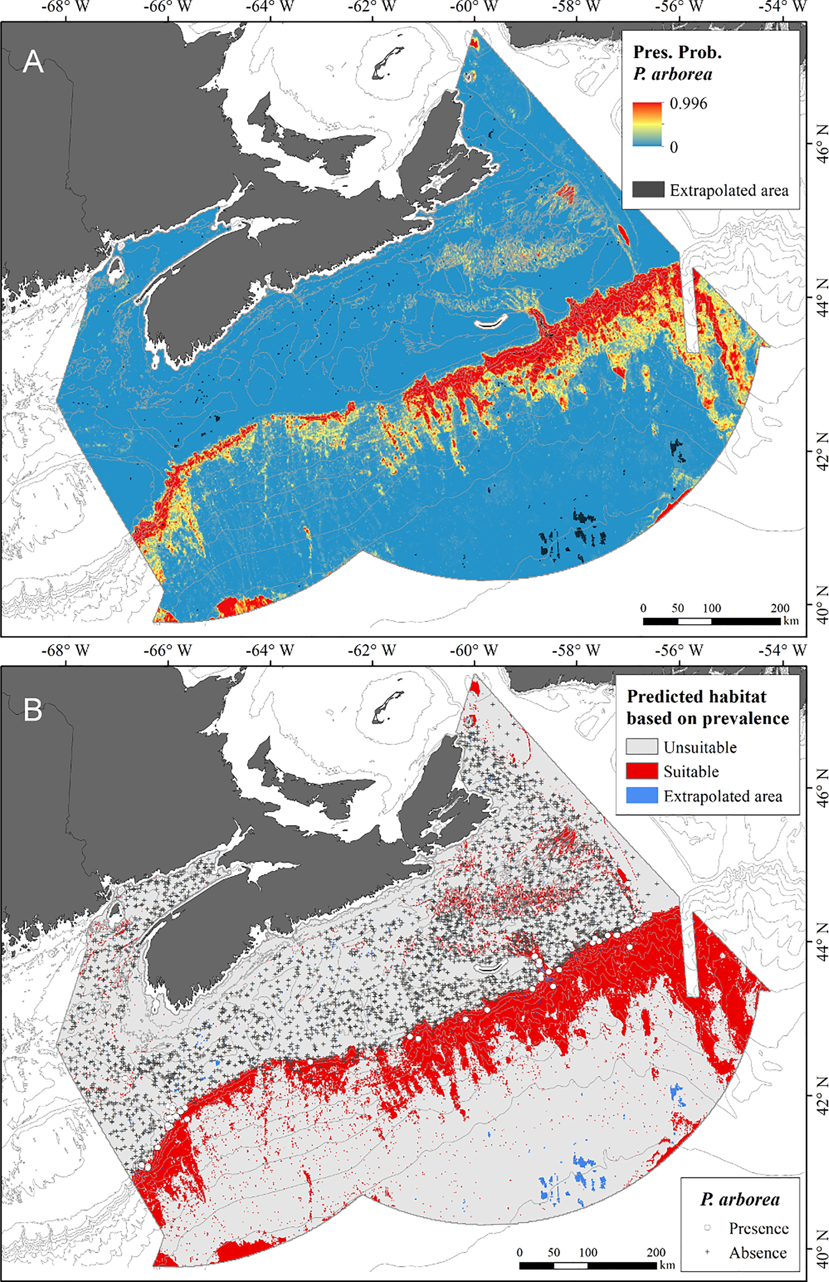 Recently, basin-scale distribution modeling of P. arborea habitat under present-day (1951–2000) and future (2081–2100) environmental conditions (the latter modeled as Intergovermental Panel on Climate Change (IPCC) Representative Concentration Pathway (RCP) 8.5, a “business-as-usual” scenario), projected an alarming loss of 99% of suitable habitat across the North Atlantic, including in the Offshore Scotian Shelf planning area (Morato et al., 2020). Consequently, a review of existing protections for this species and of the properties required for a protected area network is needed, to support effective conservation efforts. That review must necessarily consider whether the results of basin-scale modeling of P. arborea habitat can be validly applied at the scale of the planning area.