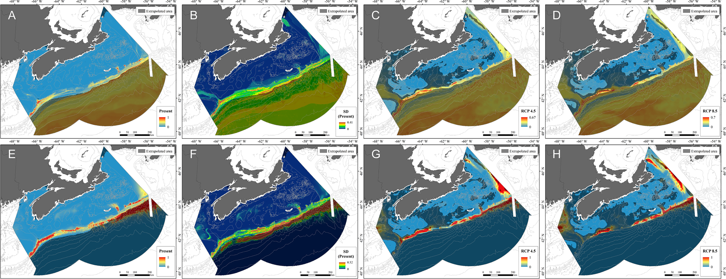 Probability of occurrence of Paragorgia arborea from RF models (A–D) and GAMs (E–H) under present-day (A, E), RCP 4.5 (C, G) and RCP 8.5 (D, H), as predicted by models constructed using 8 environmental predictors, with model uncertainty for present-day predictions (B, F) generated from the standard deviation created from 5-fold spatial block cross-validation. Areas of model extrapolation are shown on each map as a transparent overlay and were created using both presence and absence data.