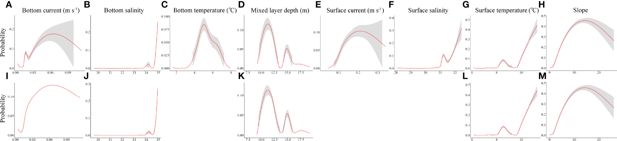 Functional response curves for RF models (A–H) and GAMs (I–M) constructed using 8 environmental predictors, under present-day conditions. (Three predictors not included in the GAMs are left blank). Shaded regions represent approximate 95% confidence intervals. All curves and confidence intervals were bounded at zero probability. (MLD, mixed layer depth. Units are as in Supplementary Table 2).