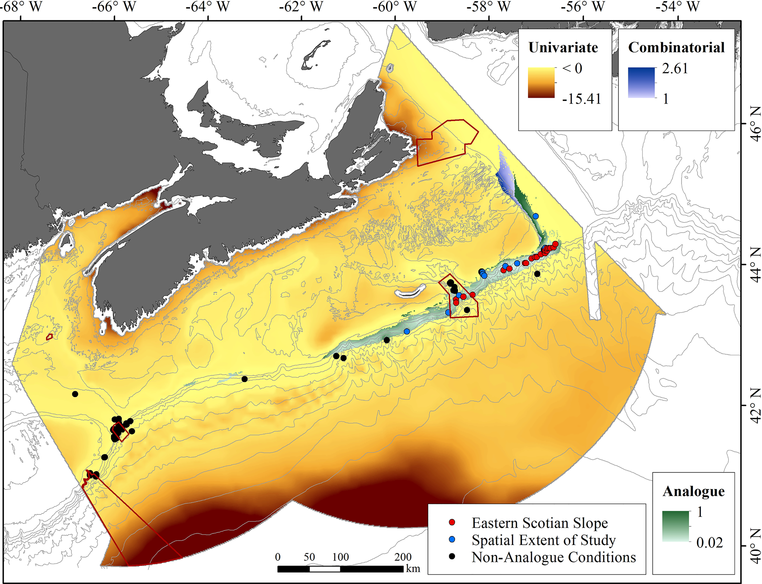 The presence and pseudo-absence data from the Scotian Shelf bioregion study area portion of the basin-scale study that were analyzed by Morato et al. (2020), were provided by Drs. T. Morato and J.-M. González-Irusta, and used in comparisons of the results of the two studies.