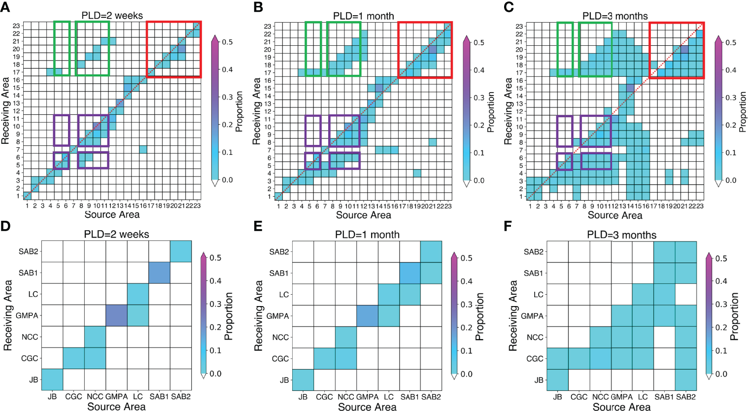 The transferability of the species distribution models (Sequeira et al., 2018; Yates et al., 2018; Liu et al., 2020) was evaluated to determine their reliability (Mesgaran et al., 2014). For areas where suitable habitat was predicted but for which no presence records were available, the potential for larvae to colonize the areas from known populations using the LPT models was evaluated.