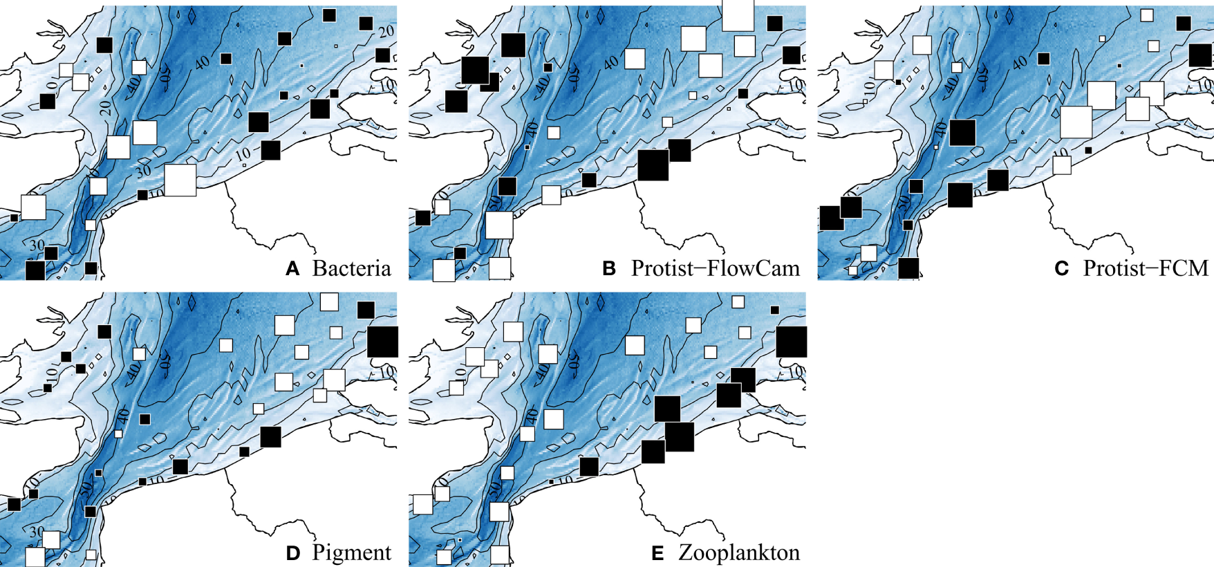Figure 3 displays the spatial variations of each biotic component total densities; complementarily, Table Ain theSupplementary Material provides statistical details for the descriptors of each biotic component. Lowest bacterial densities were concentrated around the Strait of Dover and the west side, without much variations elsewhere (Figure 3A). Protist-FlowCam densities globally decreased from the nearshore to the offshore from both west and east sides (Figure 3B), whilst Protist-FCM densities exhibited opposite trends (Figure 3C). Pigment distribution (Figure 3D) was quite similar to Chlorophyll a distribution (Figure 2M), with lowest values isolated in the southwest and northeast zones. Zooplankton density exhibited the clearest pattern with highest densities concentrated along the east coast (Figure 3E).