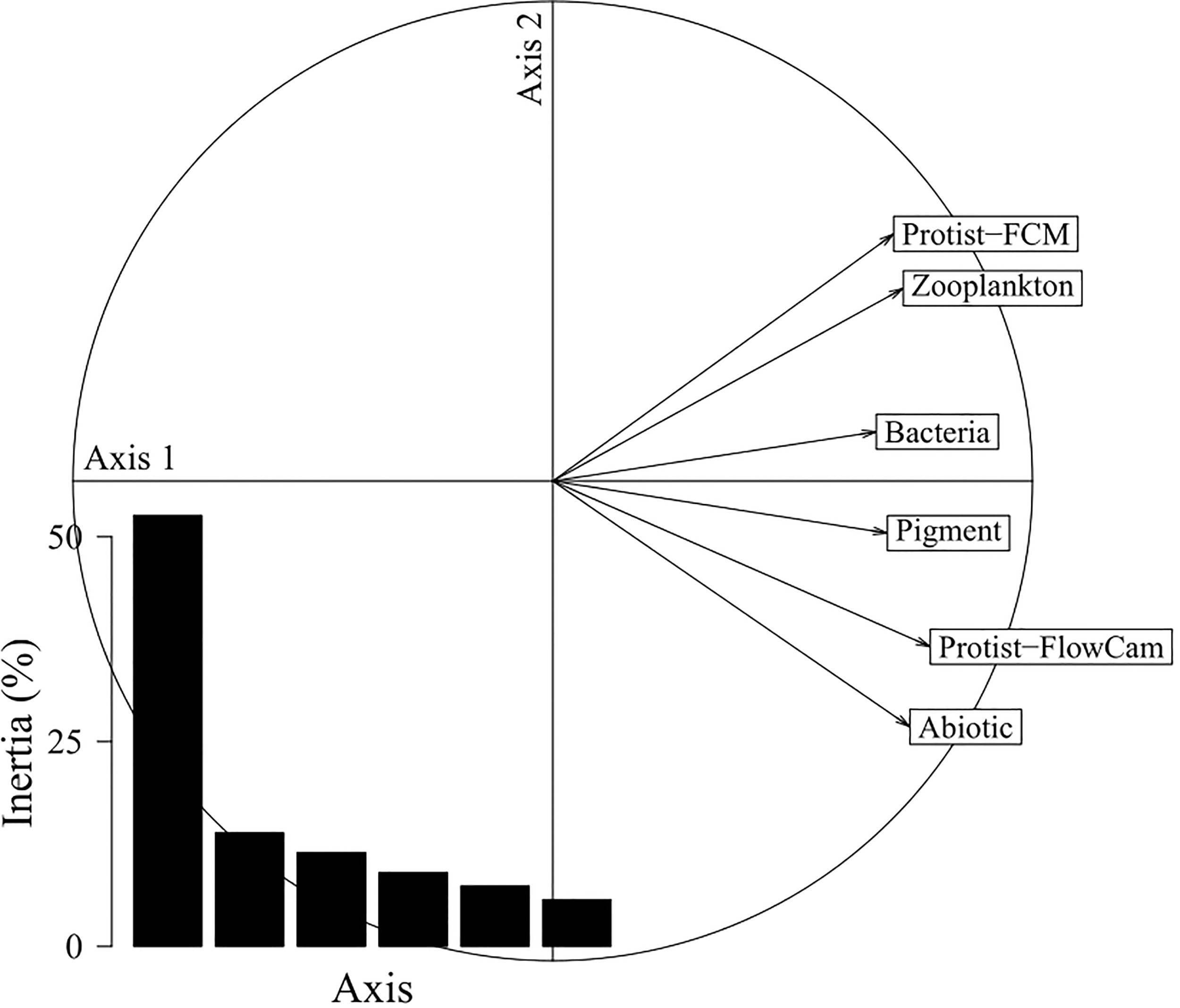 The STATIS interstructure, i.e. the relationships between the ecosystem components, is displayed on Figure 4 and shows a general uni-dimensional pattern as all components were mostly correlated along the first axis. This indicated that the ecosystem components were not independent from each other and that they reflected a common spatial pattern. As displayed in Table 4, correlations between ecosystem components were relatively homogeneous (weight around 0.40 for each component) with Bacteria and Pigment showing respectively the lowest weight (0.38 and 0.39) and Protist-FlowCAM the highest (0.45).