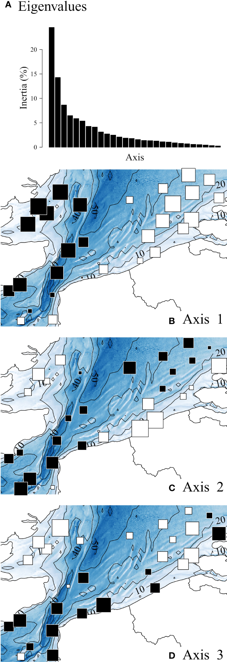 Three main axes emerged from the STATIS compromise, representing nearly 50% of the total variance of the data set (Figure 5A). The scores of the sampling stations for these three axes are mapped in Figures 5B–D.