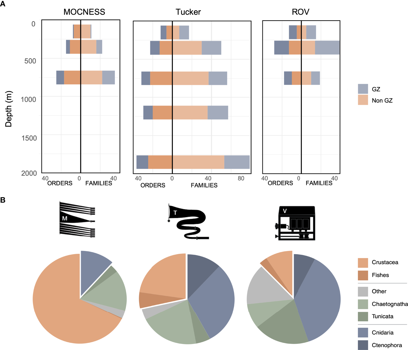 (A) Number of taxonomic orders and families and (B) mean relative abundances (%) of broad taxonomic groups of pelagic animals identified in MOCNESS, Tucker trawl, and ROV video samples in Monterey Bay. Taxa in (A) were grouped into gelatinous zooplankton (GZ; cnidarians, ctenophores, tunicates) or non-gelatinous taxa (crustaceans, fishes, mollusks, worms). Pie slices in (B) for gelatinous animals (blue) and crustaceans (orange) are isolated to highlight the primary differences between sampling methods.