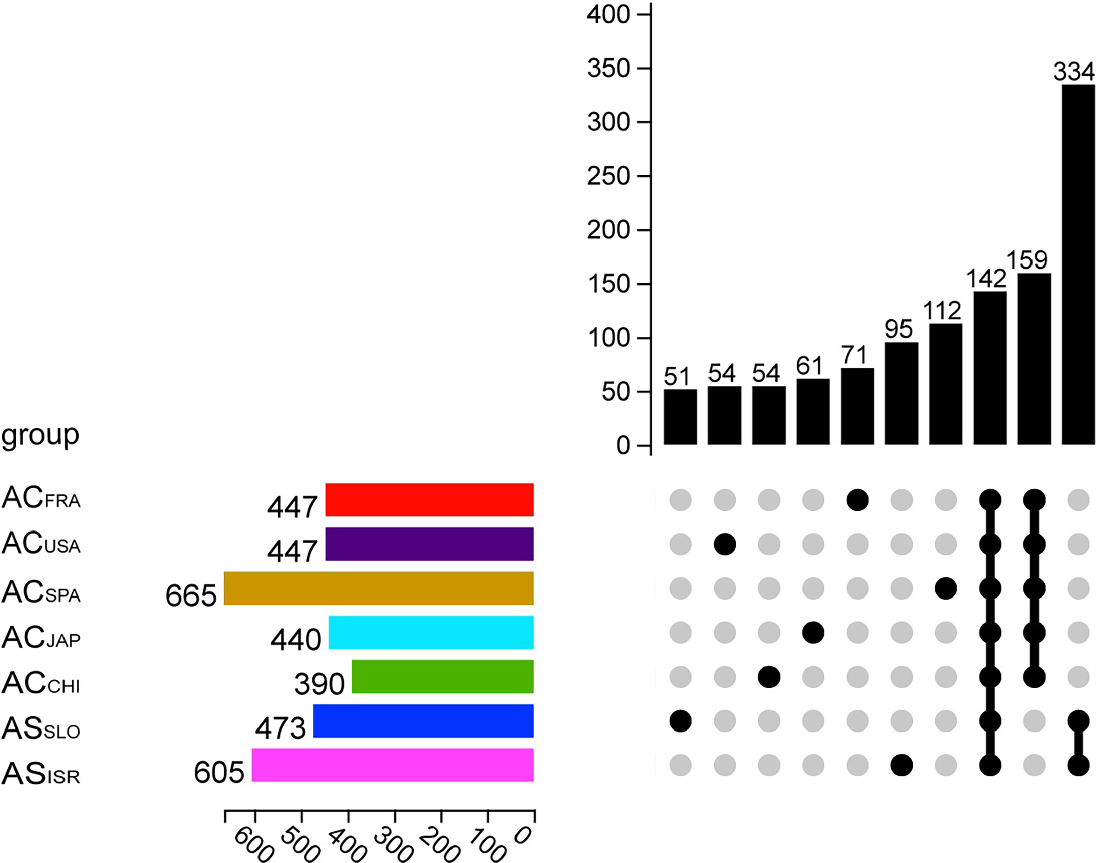 Upset plot showing OTU information of different Aurelia polyp groups. The horizontal column on the left represents the average number of OTUs in the microbiome of each group (n = 5). Each single point in the matrix below indicates that the vertical column above it showd the number of OTUs unique to the corresponding Aurelia polyp group, while the points on the matrix grouped by a line indicate that the vertical column shows the number of OTUs common to those groups.