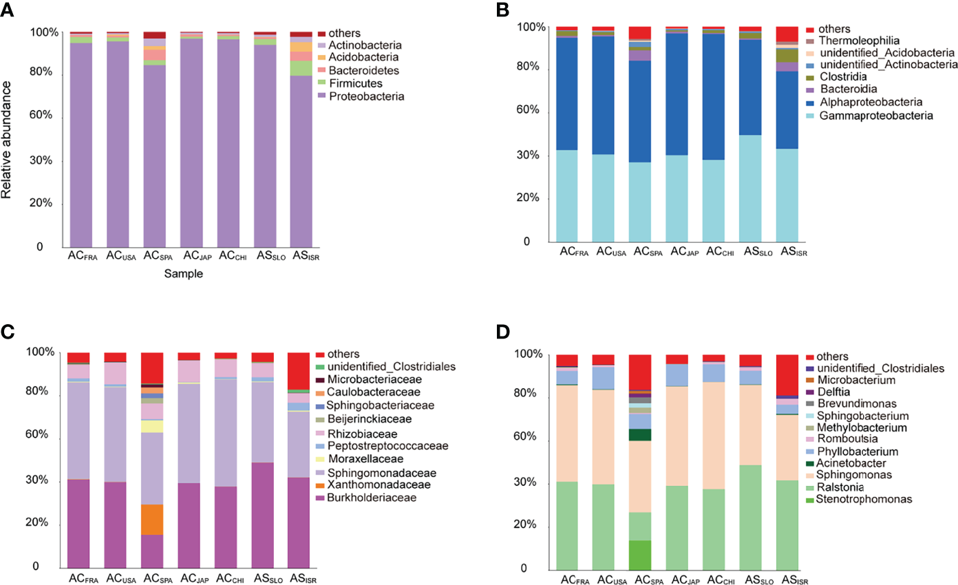 Stacked bar plots of bacterial taxa with relative sequence abundance higher than 1% at the (A) phylum level, (B) class level, (C) family level, and (D) genus level in the Aurelia-associated bacterial communities. The less abundant taxa are grouped under “others”.