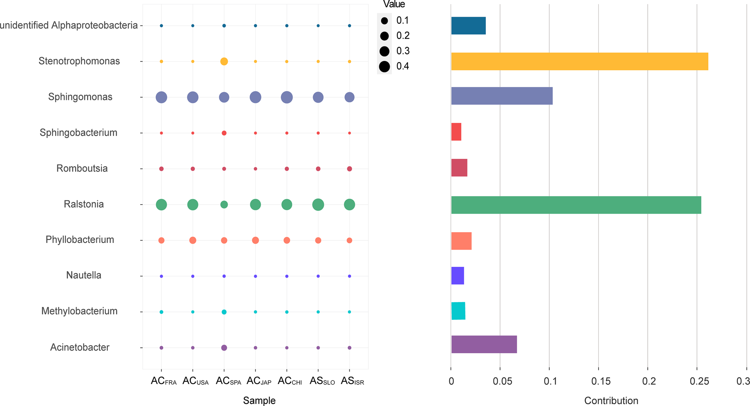 The top 10 genera contributing to the interspecific difference in the microbial community. The vertical axis represents the species. The horizontal axis represents the samples. The bubble size represents the relative sequence abundance of the species. Contribution represents the contribution of the genus in the difference between the A. coerulea and A. solida.