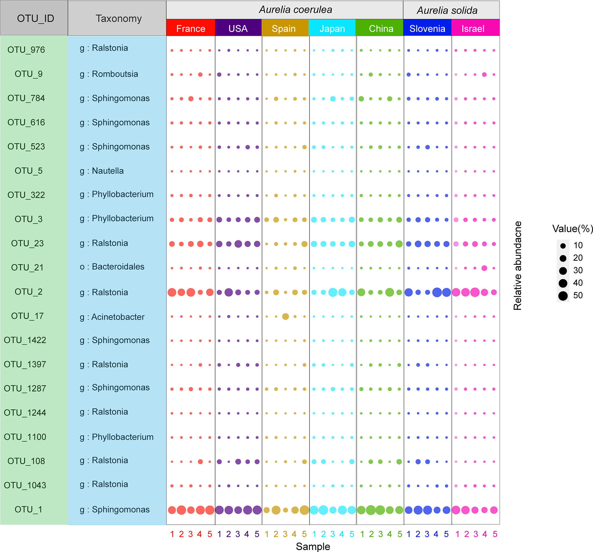 In total, 20 OTUs were found in all Aurelia polyp samples. These 20 OTUs were defined as the “core microbiome” of Aurelia polyps, accounting for 57.19% (ACSPA)–96.86% (ACCHI) of the total microbial richness (Figure 5). The genera Sphingomonas, Ralstonia, and Phyllobacterium were prominent in the core microbiome of the Aurelia polyps, accounting for 79.76% (ASISR)–92.64% (ASSLO) and 57.19% (ACSPA)–96.13% (ACCHI) of the total core microbial richness in A. coerulea polyps and A. solida polyps, respectively (Figure 5). Notably, 6 OTU members of the core microbiome had significantly different abundances between A. coerulea and A. solida polyps: OTU_2 (Mann–Whitney U test, p = 0.034), OTU_1043 (Mann–Whitney U test, p = 0.026), and OTU_1244 (Mann–Whitney U test, p = 0.037) all belonging to the genus Ralstonia, were significantly more abundant in A. solida polyps than in A. coerulea polyps. However, OTU_3 (genus Phyllobacterium, t test, p = 0.026), OTU_1100 (genus Sphingomonas, t test, p = 0.026), and OTU_1287 (genus Sphingomonas, Mann–Whitney U test, p = 0.011) were significantly more abundant in A. coerulea polyps than in A. solida polyps.