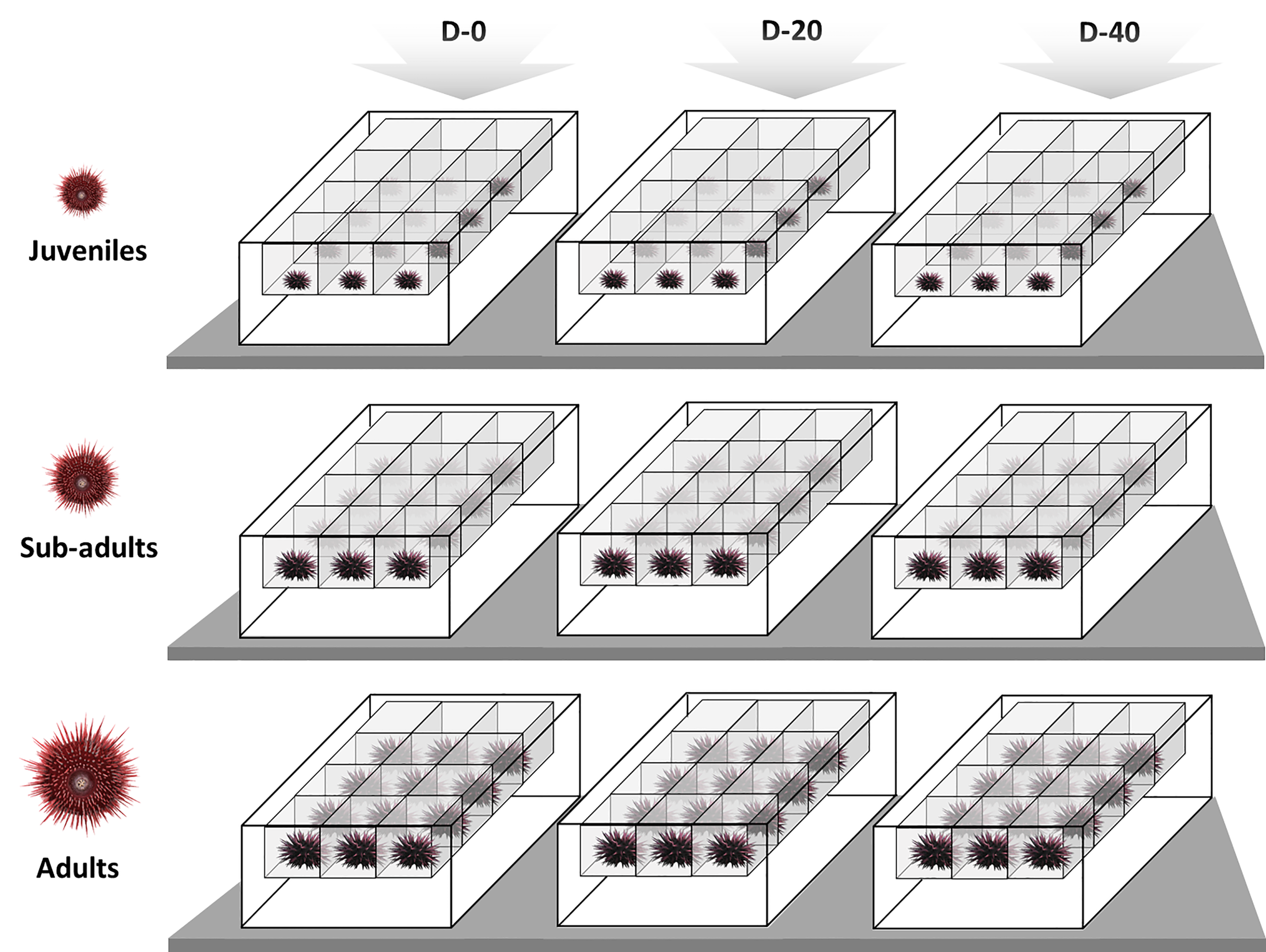 Representation of the experimental design: above the three experimental diets administrated, D-0 (100% vegetables, 0% fish meal); D-20 (80% vegetables, 20% fish meal); D-40 (60% vegetables, 40% fish meal), and at each level the respective P. lividus size classes, juveniles (15-25 mm); sub-adults (25-35 mm); adults (45-55 mm). Twelve sea urchins were employed in each condition, individually placed in feeding boxes within same RAS.