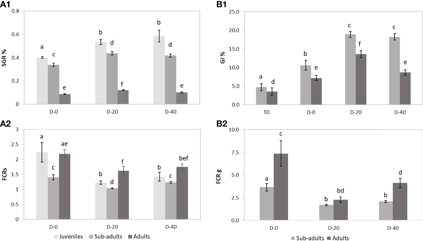 Finally, cross-comparison analysis evidenced that in all feeding condition (D-0, D-20 and D-40) the GI and FCRg detected for sub-adults were respectively higher and lower than values obtained in adults (Figure 3).