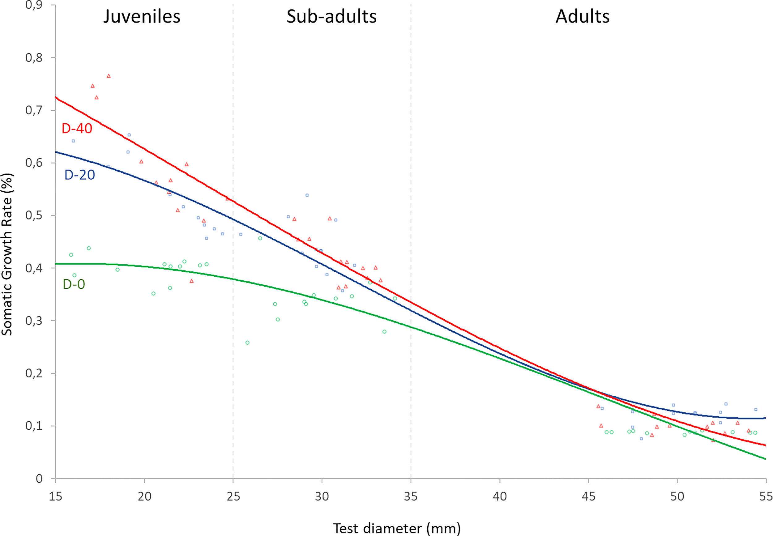With regards to sub-adults, SGR, although lower than in juveniles, was higher than in adults in each diet. This is in accordance with general growth theory, for which energy allocation (EA) changes with the variation in animal size. Therefore, the proportion of food energy allocated to somatic growth decreases with the increase in sea urchin size, whereas a higher allocation for reproduction is observed with size growth (Giese et al., 1966; Fernandez and Boudouresque, 2000; McCarron et al., 2009).