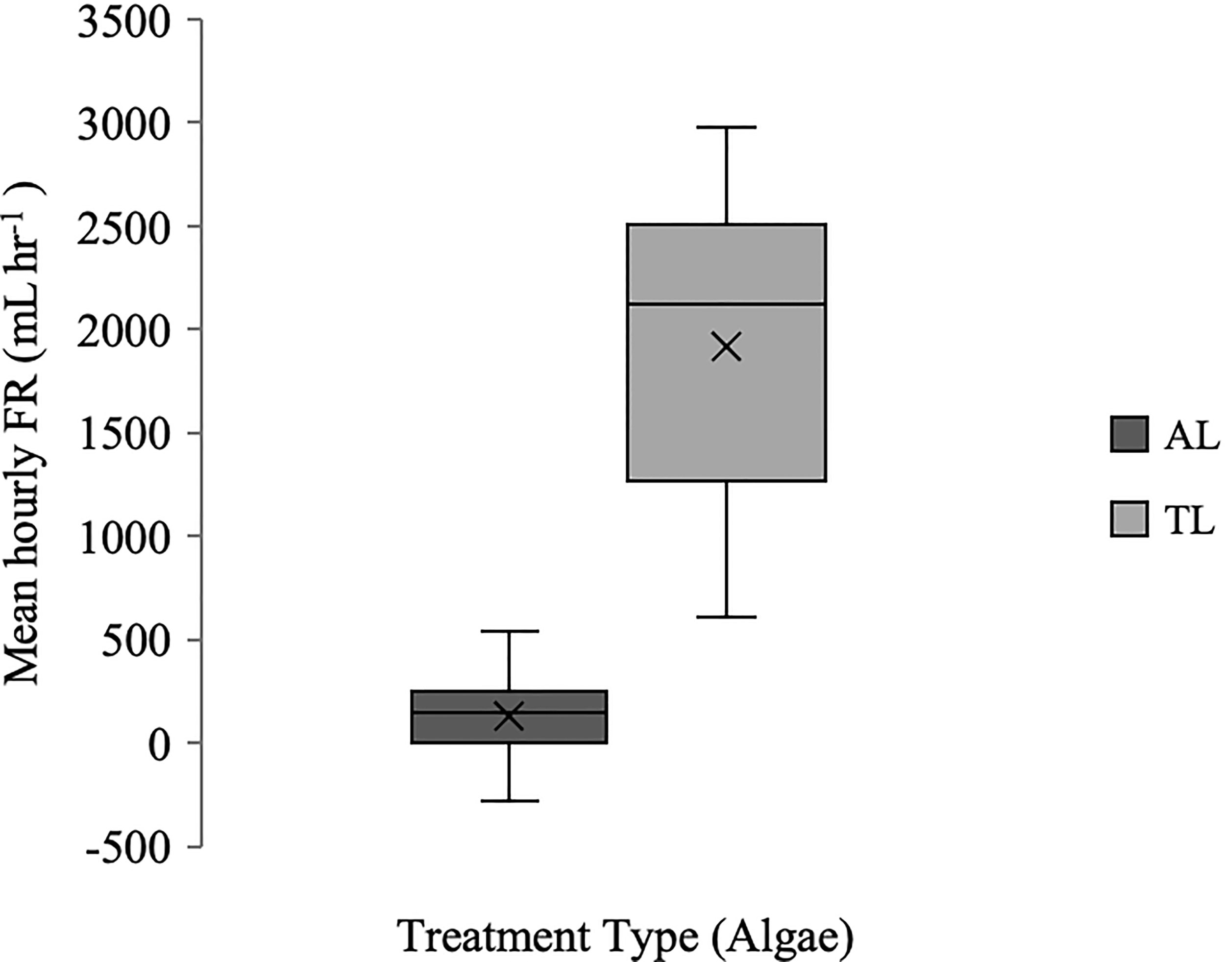 Boxplot (x = mean, n=10) of hourly FR (mL hr-1) for Styela plicata exposed to Aureoumbra lagunensis (AL) or Tisochrysis lutea (TL, control).