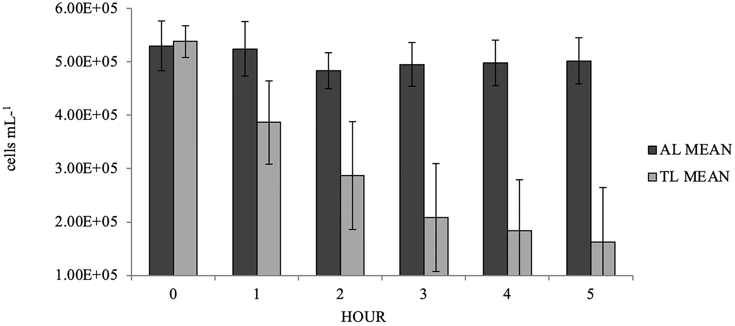 Mean (± s.d., n=10) hourly microalgae cell densities for Styela plicata exposed to Aureoumbra lagunensis (AL) or Tisochrysis lutea (TL, control).