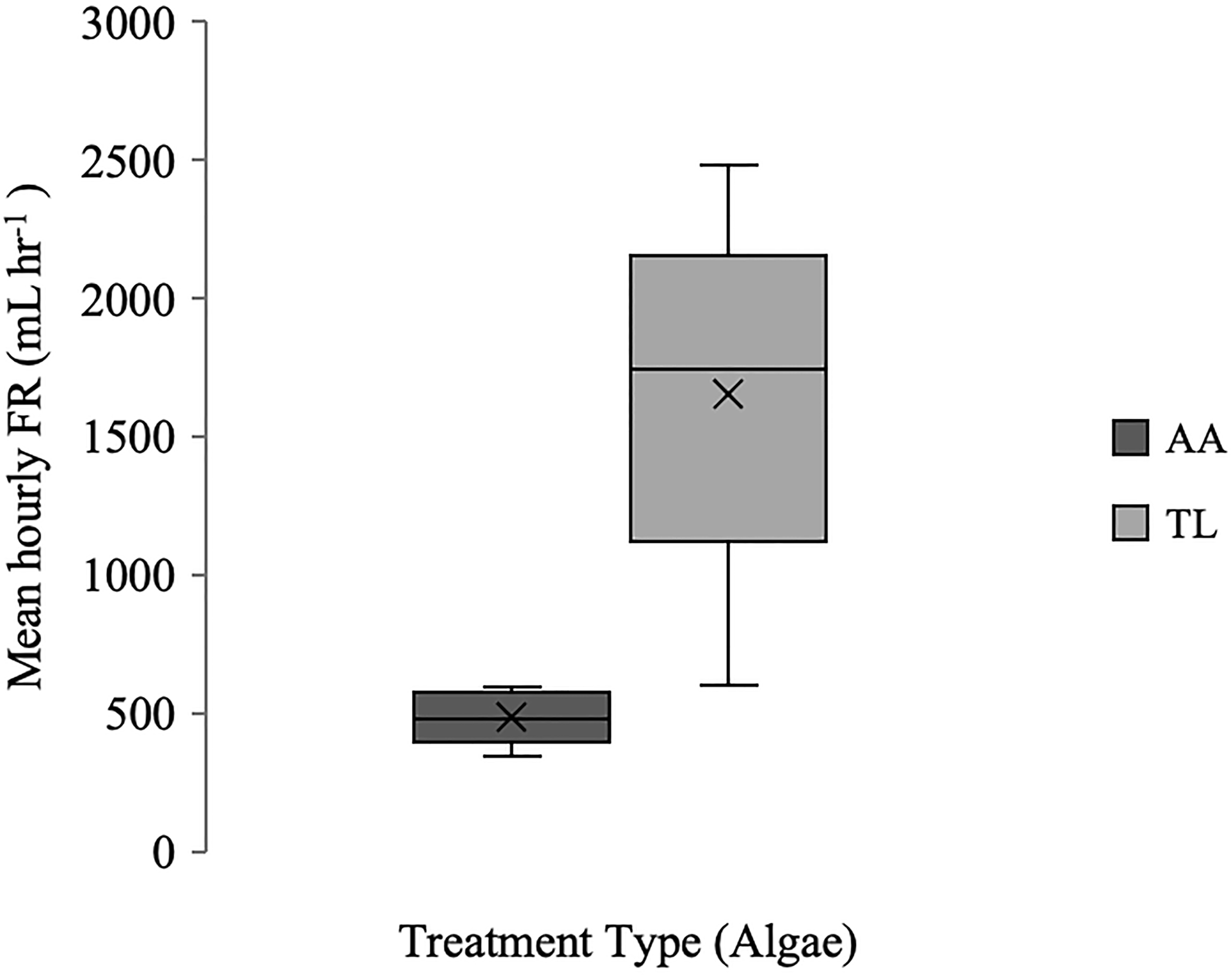Boxplot (x = mean, n=10) of hourly FR (mL hr-1) for Styela plicata exposed to Aureococcus anophagefferens (AA) or Tisochrysis lutea (TL, control).