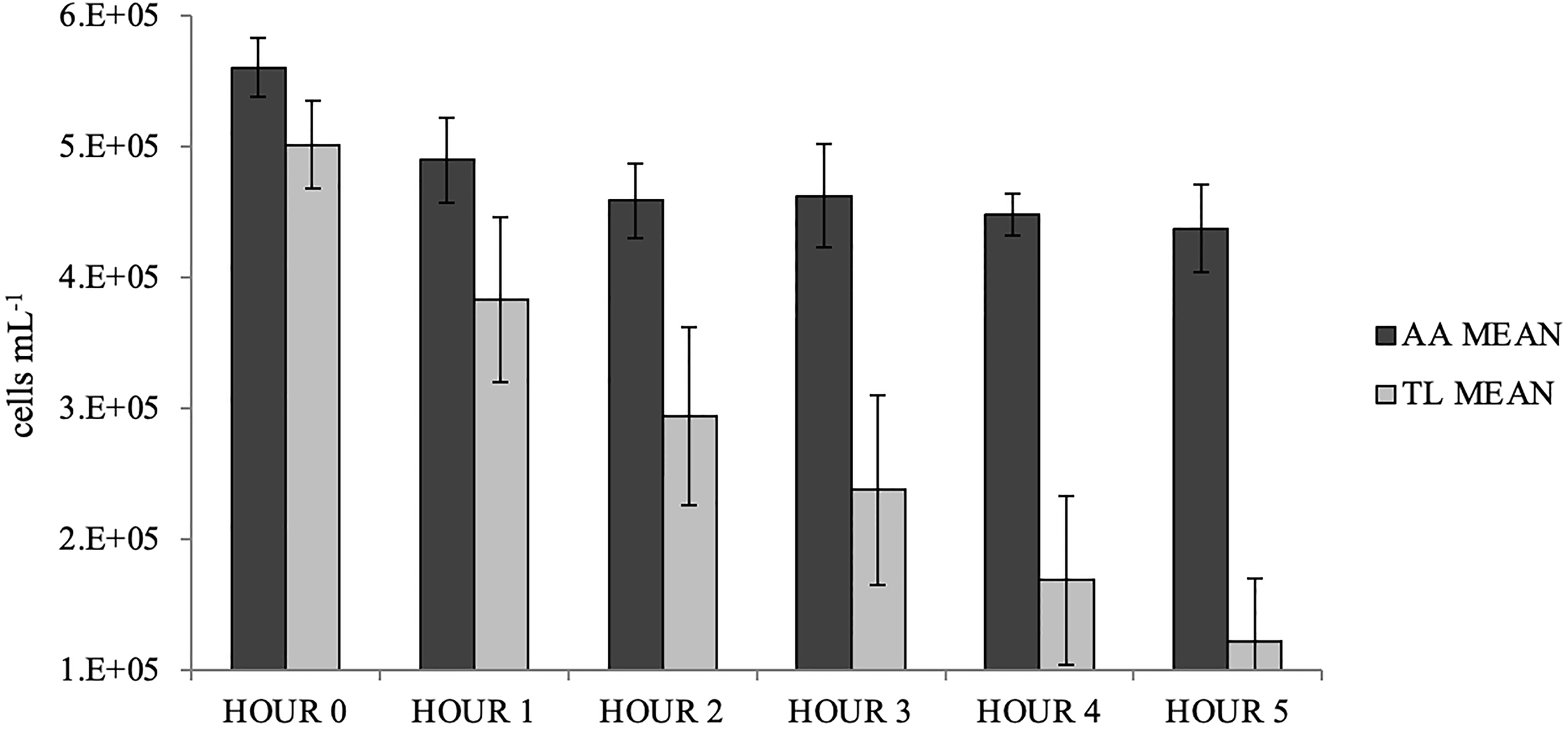 Mean (± s.d., n=10) hourly microalgae cell densities for Styela plicata exposed to Aureococcus anophagefferens (AA) or Tisochrysis lutea (TL, control).