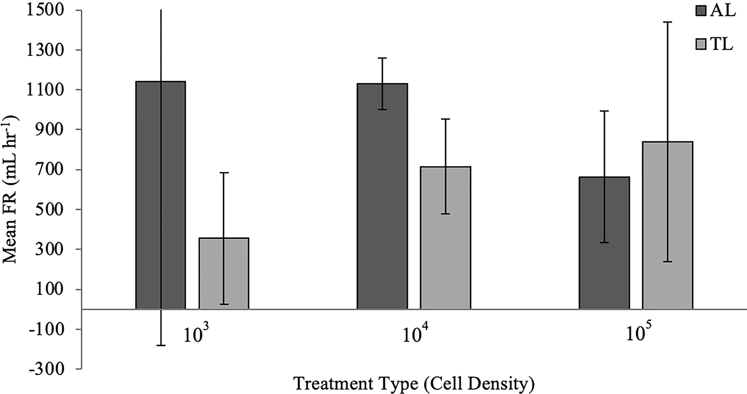 Mean (± s.d., n=3) FR (mL hr-1) for Styela plicata exposed to Aureoumbra lagunesis (AL) or Tisochrysis lutea (TL, control) at varying starting cell densities (x-axis; cells mL-1).