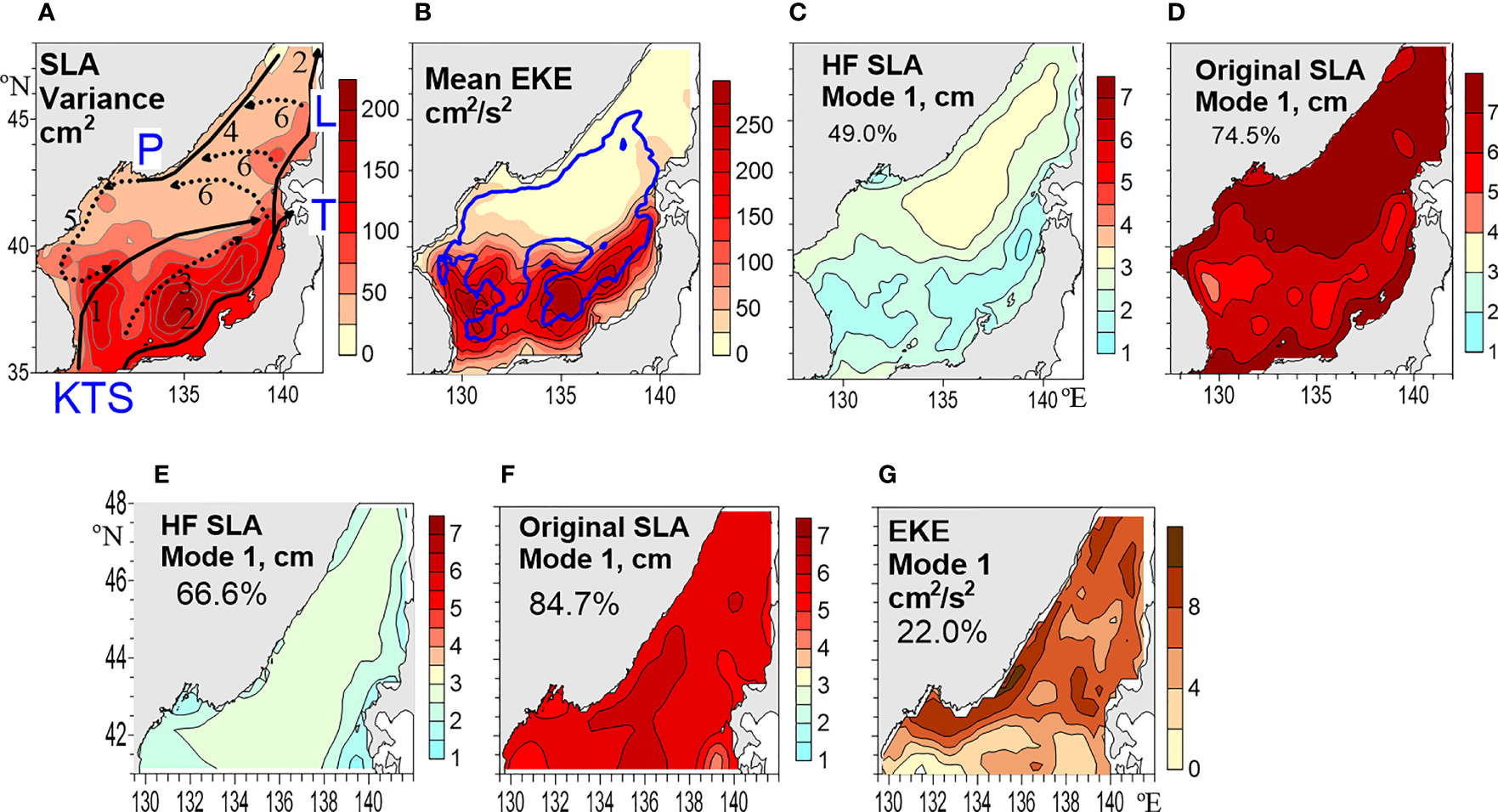 (A) Sea level variance (cm2). Currents are schematically shown by arrows and labeled by numbers: the East Korea Warm Current (EKWC) and its continuation off the coast by 1, the Tsushima Warm Current (TWC) by 2, the East Sea Current by 3, the Primorye (Liman) Current by 4, the North Korea Cold Current (NKCC) by 5, the western branches of the TWC by 6; the intermittent currents are shown by the dotted lines. Peter the Great Bay is marked by the letter P, the KTS, Tsugaru and La Perouse (Soya) Straits are marked as KTS, T, and L, respectively. (B) Time-averaged EKE from the satellite altimetry data (cm2/s2); 2000-m isobath is shown by the blue contour. EOF 1 (cm) from the (C, E) high-frequency (HF) and (D, F) original SLA for the (C, E) entire and (D, F) northern JES. (G) EOF 1 (cm2/s2) from EKE in the northern JES. Contours are shown for every 25 cm2 in (A), 25 cm2/s2 in (B), 0.5 cm in (C, E, F), 1 cm in (D), and 2 cm2/s2 in (G).