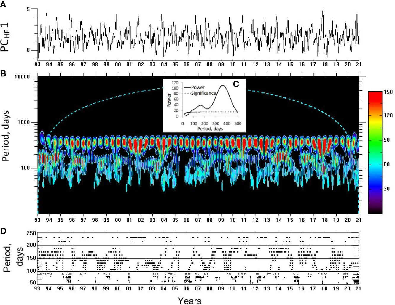 (A) The principal component PCHF 1 (dimensionless) for the northern JES, (B) its WT spectrum, (C) its time-averaged WT spectrum, and (D) the periods (days) of maximum power in the range between 50 and 250 days. In (B) and hereafter the 90% confidence levels are shown by solid cyan contours and COIs by dashed cyan lines.
