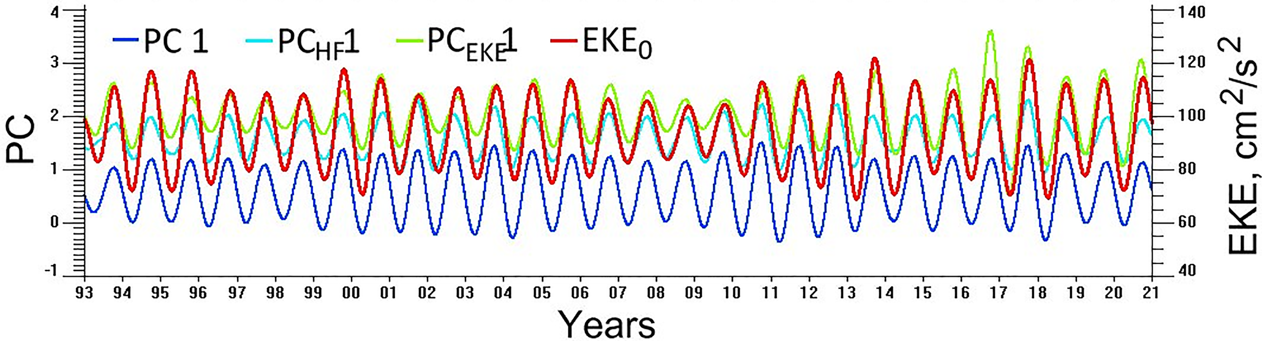 Thus, the seasonal cycles of PCHF 1, PC 1, PCEKE 1 and EKE0 match each other, with the pair correlations between the band-bass filtered timeseries of 0.89–0.95 (Figure 4). Moreover, they match the seasonal variation of the mean currents in the JES, strengthening in summer and fall and slackening in winter and spring, with the seasonal extremes in October and March, respectively (Trusenkova and Kaplunenko, 2013). Therefore, the spatial pattern and annual cycle of the leading EKE mode indicate that mesoscale processes are generated by instability of the mean currents.