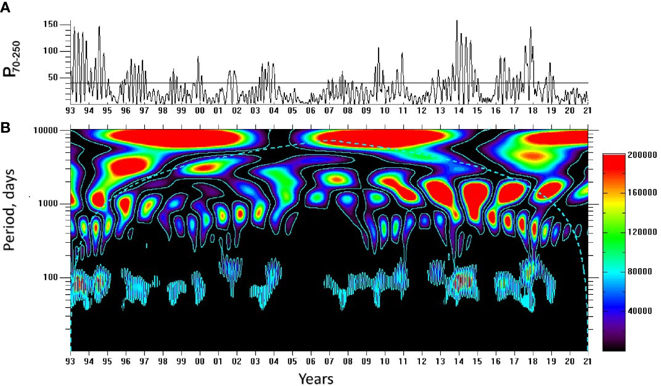 To further analyze interannual changes of intra-annual sea level fluctuations, the WT spectrum of PCHF 1 was integrated in the 70–250-day range and averaged (P70–250). Note that CMEMS provides daily SLA but the satellite repeat periods are about 10 days for the rarely spaced T/P – Jason tracks and 35 days for the denser spaced ERS – Envisat – Saral tracks (https://www.aviso.altimetry.fr/en/missions.html). This is why the Nyquist period was accepted as 70 days and was taken as the lower bound of the range. The P70–250 timeseries is shown in Figure 5A and its WT spectrum in Figure 5B.