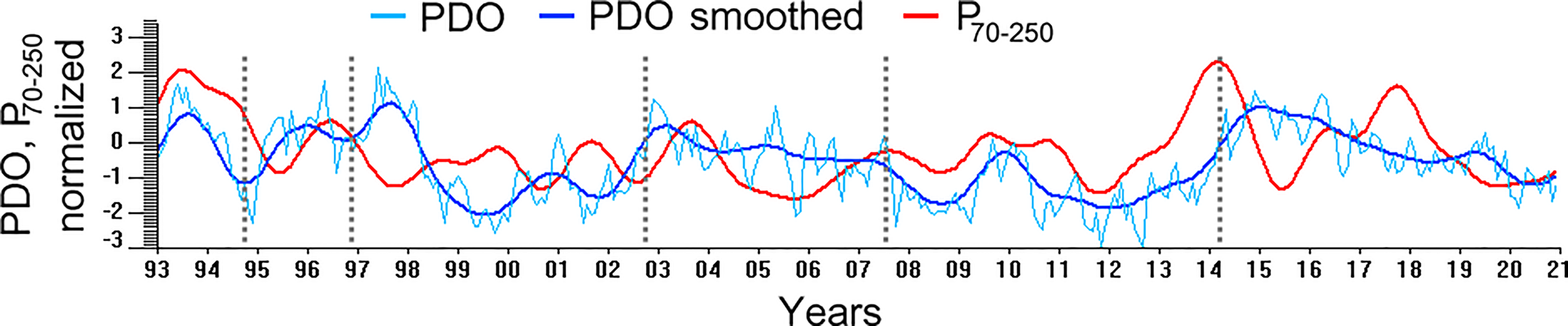 The low-pass filtered, with the cut-off period of 1.5 year, timeseries of (red line) P70–250 and (blue line) PDO index; the original PDO index is shown for comparison by light-blue line. The vertical grey dashed lines separate the times with different character of the relationship between PDO and P70–250.