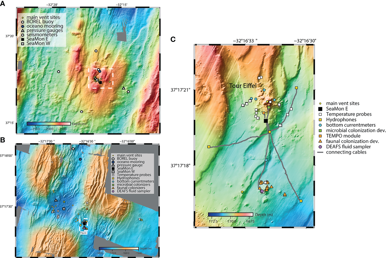 The first node, SeaMoN west, is deployed at a former lava lake that formed within a series of rifted volcanic cones at the summit of the central volcano (e.g., Ondréas et al., 2009; Escartı́n et al., 2014). This node measures seafloor seismic activity, vertical seafloor motion, and is presently also equipped with the multisensor platform EGIM (EMSO Generic Instrumentation Module) that comprises a turbidimeter, a CTD, an ADCP, one hydrophone, an Oxygen optode, and a pressure gauge (Lantéri et al., 2022). The SeaMoN East node is deployed at the base of the Tour Eiffel active hydrothermal edifice and is dedicated to physical, chemical and ecological studies. An High-Definition (HD) video camera module (Sarrazin et al., 2007), chemical sensor (Laës-Huon et al., 2020), and thermistor string, support studies of the dynamics of mussel assemblages and their environment. Biological and chemical properties of high-temperature fluids are monitored with the microbial colonization module CISICS (Connected In Situ Instrumented Colonizing System), and the in situ automated sampling of high-temperature hydrothermal fluid device DEAFS (DEep sea Autonomous Fluid Sampler). The two nodes are acoustically linked to a surface relay instrumented buoy, ensuring satellite communication to the land base station in Brest, France. Data are archived, published with a DOI, and available on the EMSO-Azores web page (Box 1).