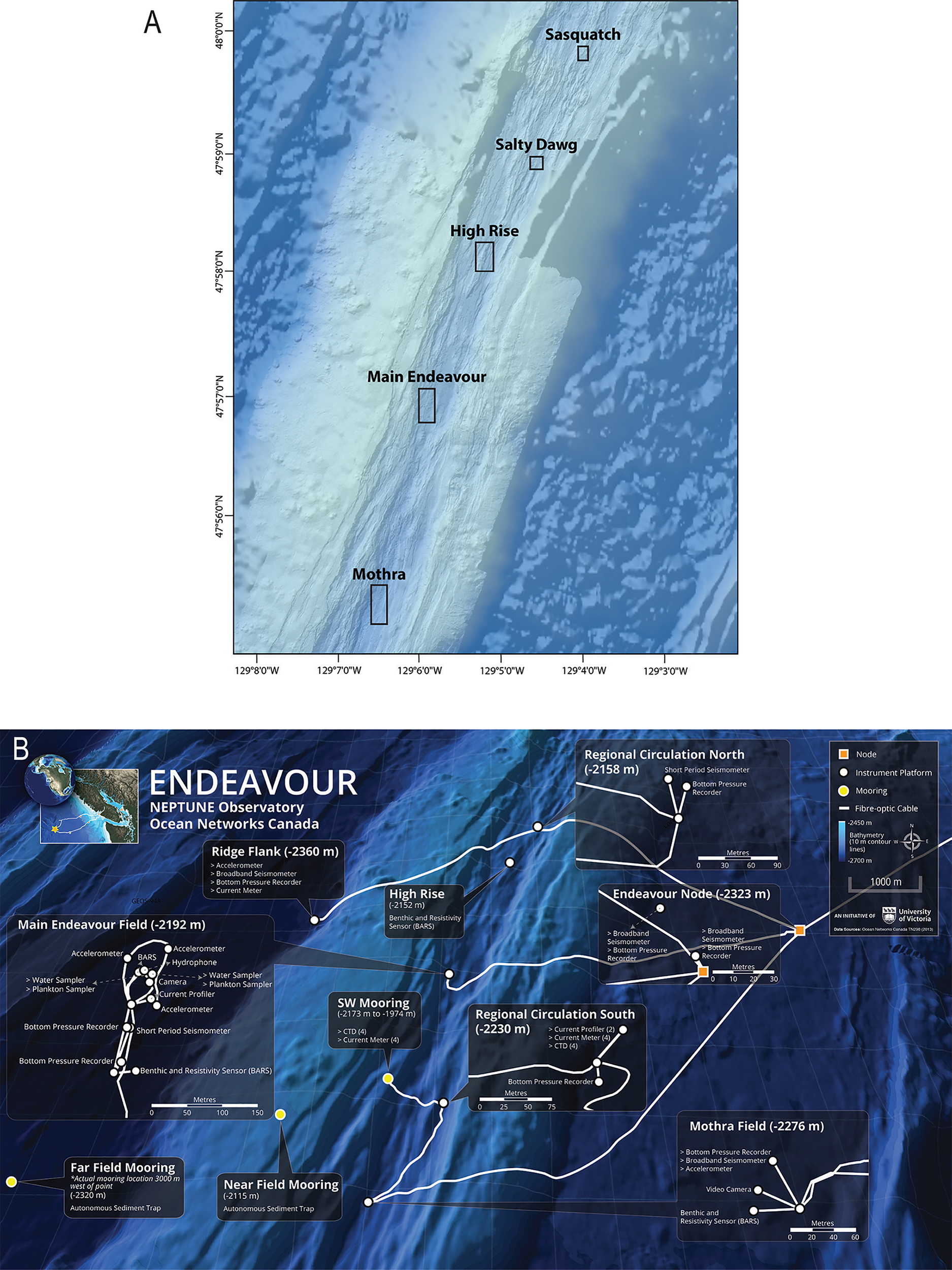 The Ocean Networks Canada on the Endeavour segment of the Juan de Fuca Ridge. (A) Regional bathymetry showing the main hydrothermal vent fields. (B) Details of the instruments location at the Endeavour node.