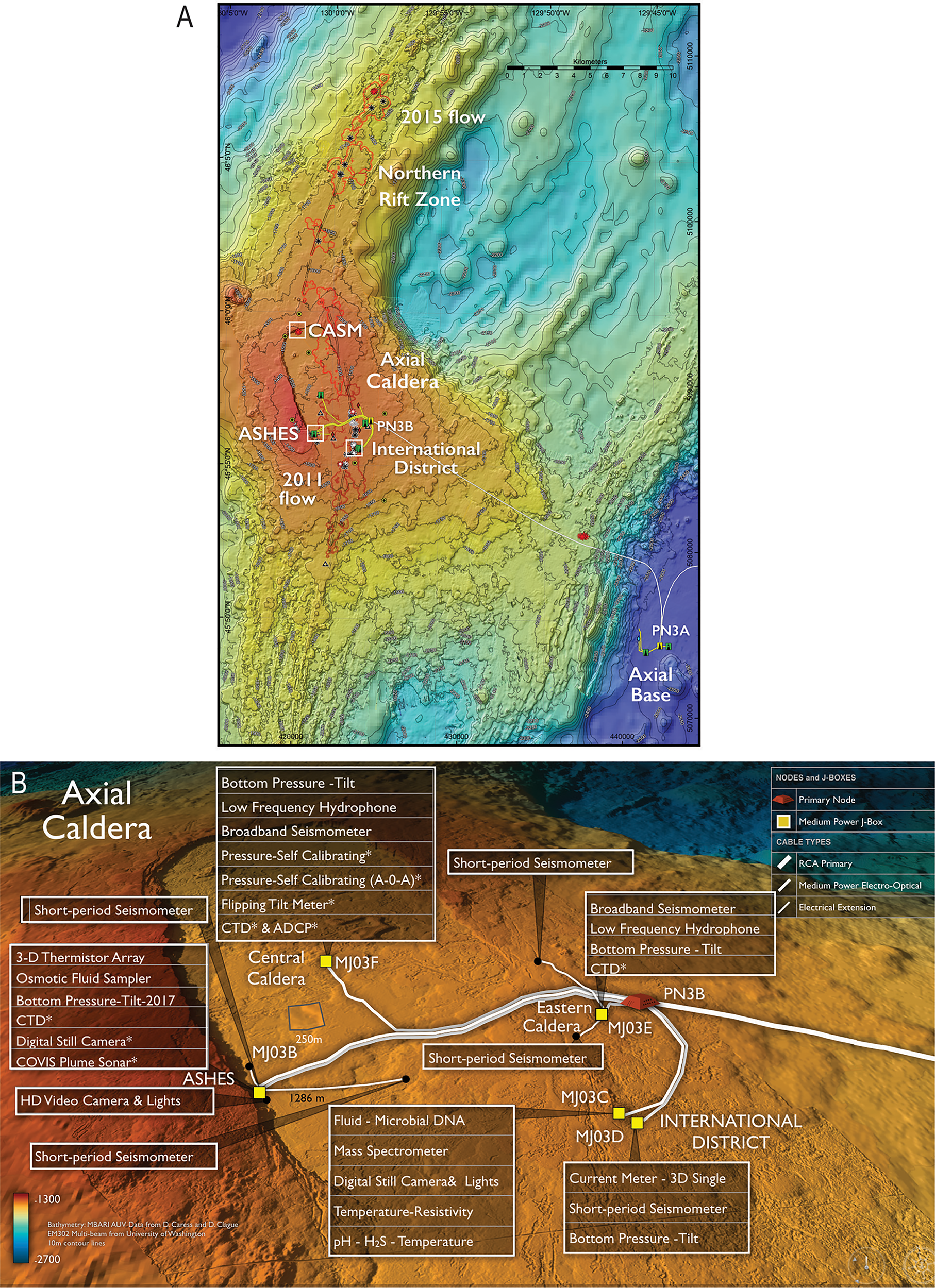 The OOI marine infrastructure was designed and built to meet science requirements developed through community workshops, which identified broad-ranging critical ocean science questions requiring comprehensive and sustained (up to ~25 years) ocean observing infrastructure, enabling examination of processes at multiple spatial (ocean basin to tidal basin) and temporal (short-term, stochastic events and large-scale decadal cycles) scales. The Axial observatory is part of the RCA (Box 1; Figure 4). A 525 km-long, high power (10 kV) and bandwidth (10 gb/s) submarine fiber optic cable provides power and two-way communication from Pacific City, Oregon, to the volcano. In 2014, the RCA observatory was installed at the base and within the caldera of Axial Seamount. Axial Caldera currently hosts a diverse array of 23 core seafloor instruments (Figure 4). In 2016, following commissioning of the RCA, NSF opened the door to Principal Investigators (PI) to add infrastructure onto the RCA through funding outside of OOI. Within Axial Caldera, nine PI instruments are now on the cable and there are three uncabled instruments. Twenty additional cabled and uncabled instruments are funded for installation in the caldera and on its walls. Infrastructure located in Axial Caldera is focused at four sites: The ASHES and International District Hydrothermal Fields, and the Central Caldera and Eastern Caldera sites focused on geophysical investigations (Figure 4).