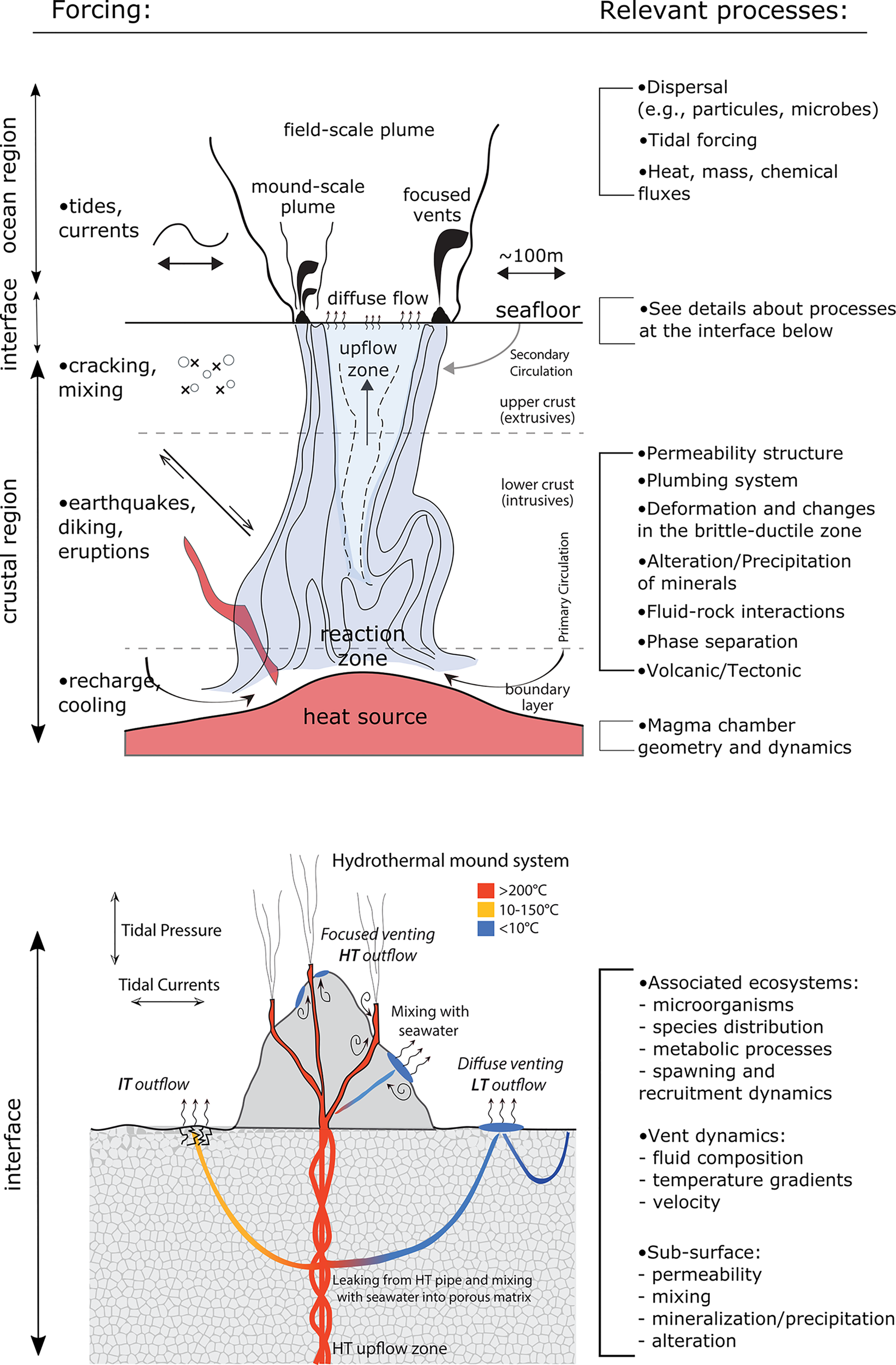 | Chemistry | Chemical signatures: time-scale, stability, low- and high-temperature Phase separation Dynamic coupling of diffuse/focused venting Magmatic chamber replenishment Mixing Mineral precipitation, chemical speciation, chemical fluxes |