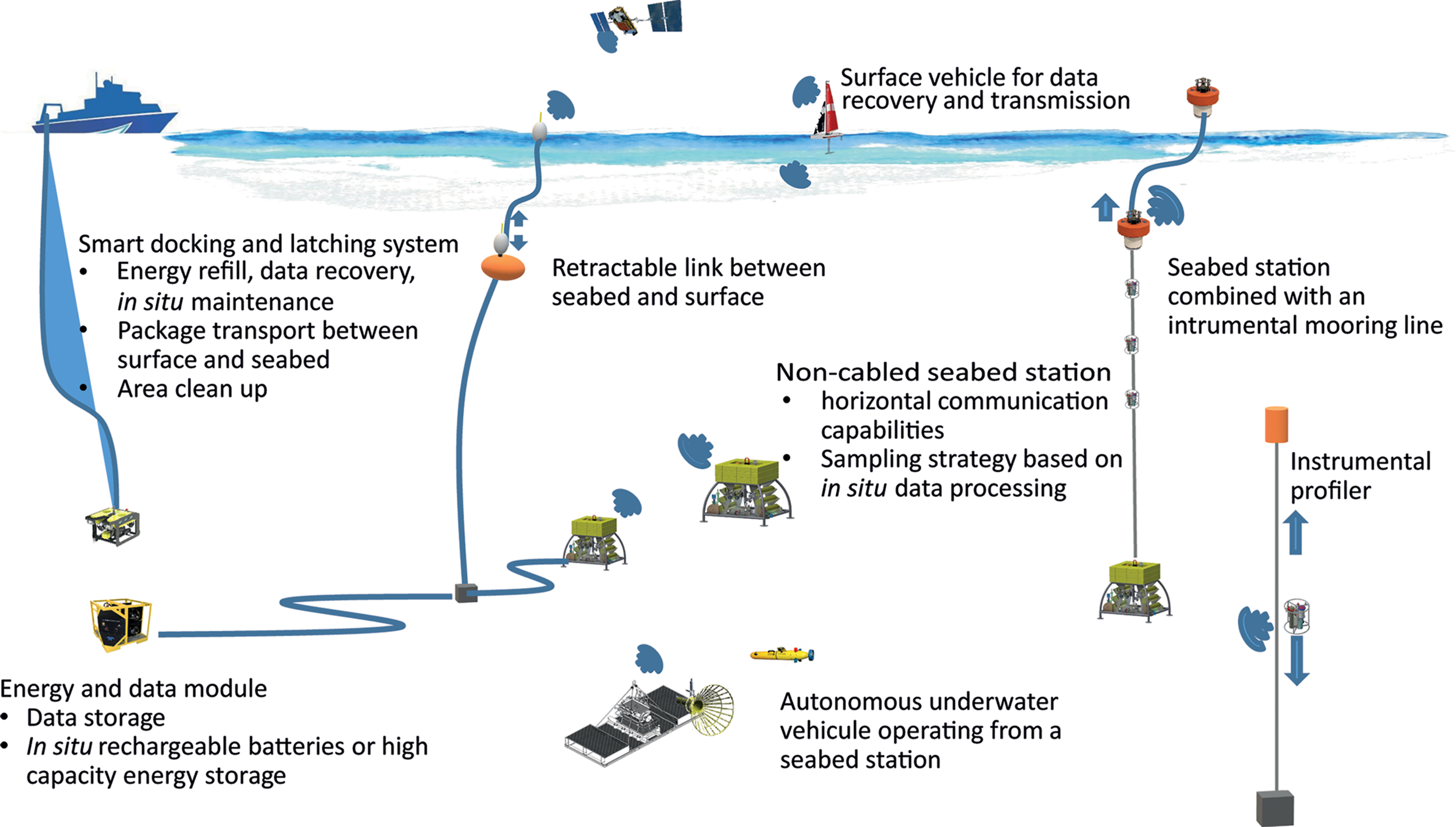 The need for long-term, time-series measurements of key ocean variables with a specific focus on the deep-sea (Thiel et al., 1994), has been identified as a critical topic since the 1990s (National Research Council, 2000), and has led to the development of seafloor-water column observatories. The Committee on Seafloor Observatories, bringing together scientists from all fields of Ocean and Earth sciences, gathered in 2000 to provide a vision for a global Seafloor Observatory Network including the risks and benefits of ocean observation platforms (National Research Council, 2000). They defined “seafloor observatories” as an autonomous “system of instruments, sensors, and command modules connected either acoustically or via a seafloor junction box to a surface buoy or a fiber optic cable to land”. This comprehensive report highlighted scientific questions that observatories could specifically address. Observatories were foreseen as requiring a major investment of resources over many decades. In the following two decades, a number of observatories have developed around the world, with instruments distributed from seafloor to the water column (e.g., Kelley et al., 2014; Smith et al., 2018; Dañobeitia et al., 2020). More recently an observatory was defined as an “integrated observing, monitoring, and experimenting infrastructure which aims to collect high-resolution data in a restricted geographical region” (Crise et al., 2018). One of the first areas of interest for observatories has been highly-dynamic mid-ocean ridges and back-arc spreading centres, where seafloor volcanism and tectonic activity predominate.