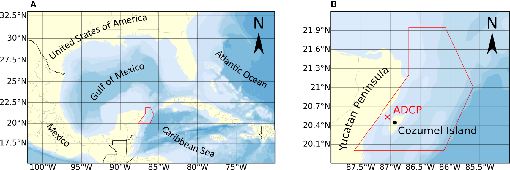 (A) Study area within the Mexican Caribbean and (B) position of the acoustic Doppler current profiler (ADCP).