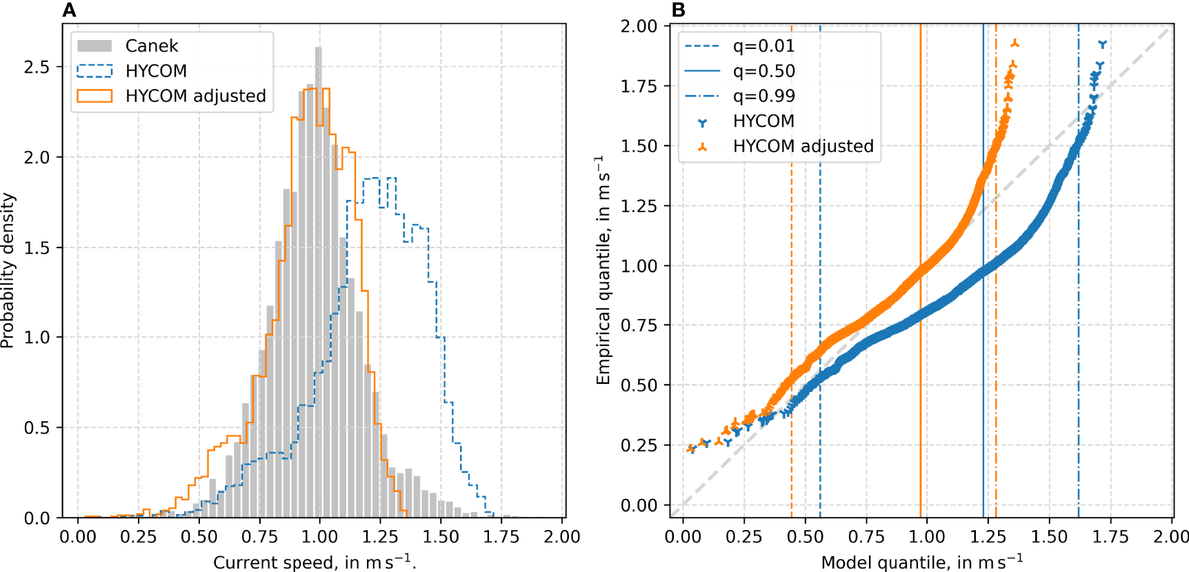 Adjustment of the HYCOM numerical data to the Canek-project empirical data [from the ADCP shown in Figure 1 (B)]. (A) Histogram showing the numerical data before and after the adjustment. (B) Q-Q plot of numerical data before and after the adjustment. The 0.01st 0.5th and 0.99th-quantiles are marked for both data sets.