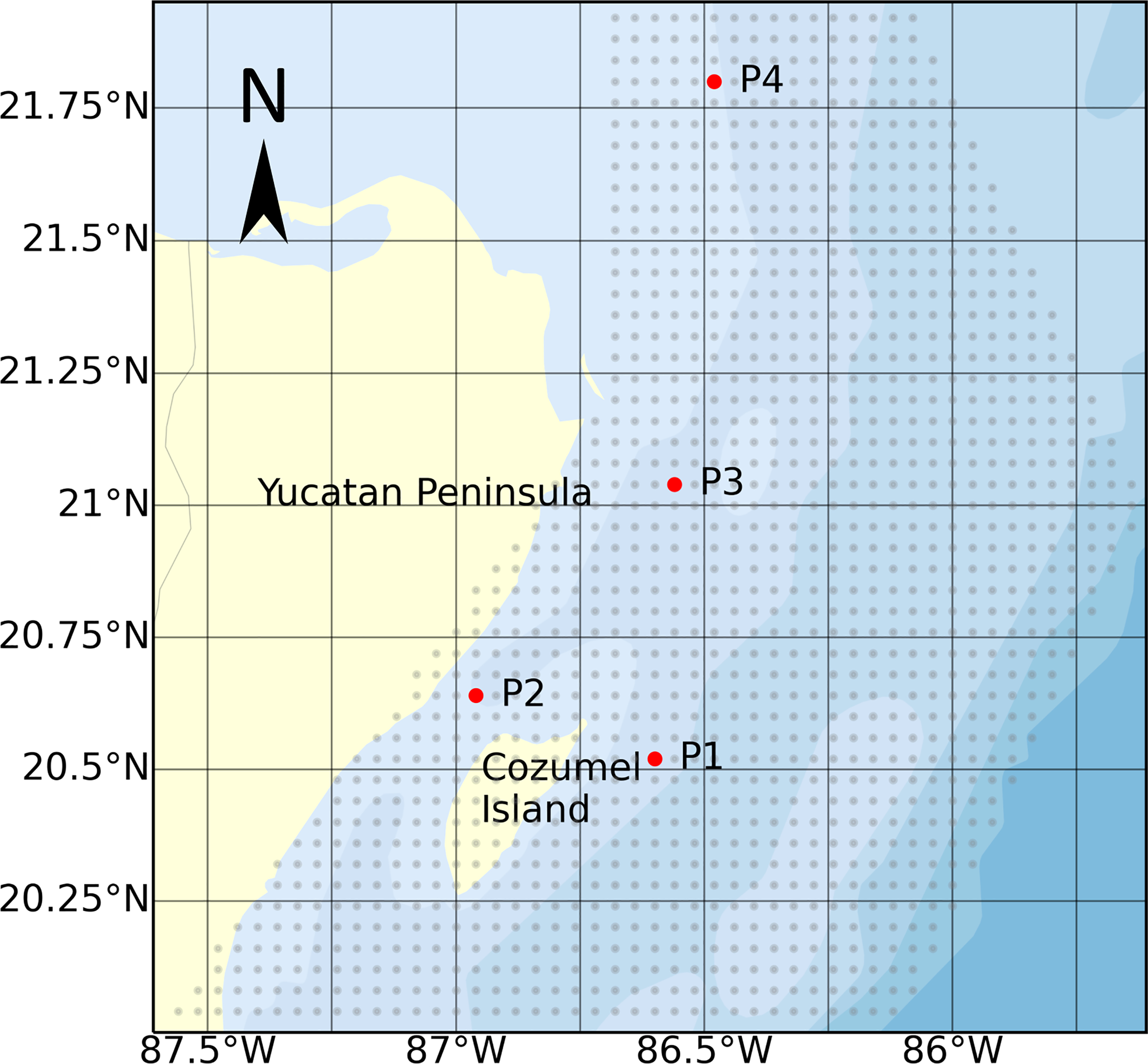 The methodology was applied to several nodes in the Mexican Caribbean, shown as grey dots in Figure 4. It should be noted that not every node contains data on the current, as some are on land, or in waters of less than 50m depth. The four nodes marked in red were selected as the results suggest that it is possible to obtain a different behaviour with respect to the GPD fit. The node at position P1 (20.520° N, 86.600° W) is where the current is most concentrated off the east coast of Cozumel. The node at position P2 (20.640° N, 86.960° W), is in the Cozumel Channel, near a possible site for the installation of ocean current turbines [see Alcérreca-Huerta et al. (2019)]. That at P3 (21.040° N, 86.560° W) is in the wake of the Cozumel Channel, off the coast of Cancun, and the node at P4 (21.800° N, 86.480° W) is in the Yucatan current northeast of Cancun.