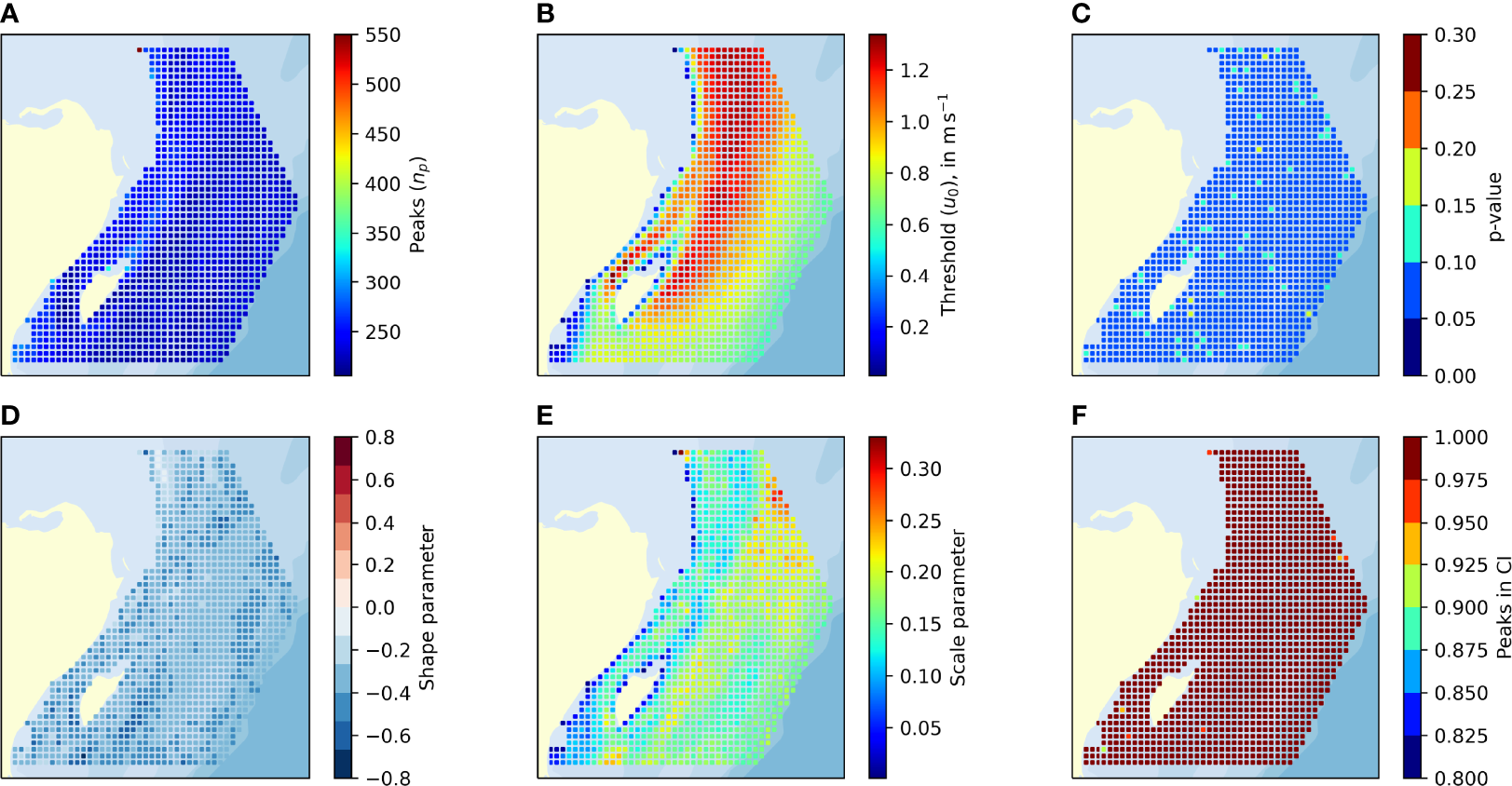 Statistical data for the GPD fit. (A) Number of identified peaks. (B) Selected thresholds. (C) p-value for the selected thresholds. (D) Shape factor for GPD fit to POT. (E) Scale factor for GPD fit to POT. (F) Share of peaks within the CI95%.