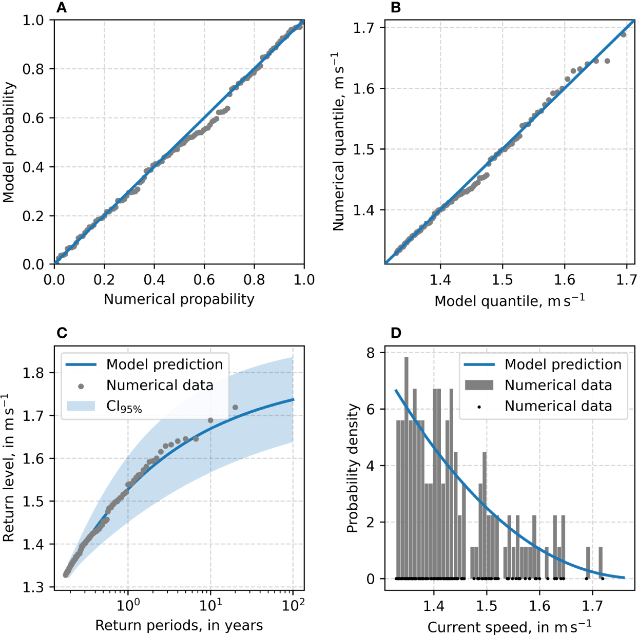 The plots in Figure 13 bring into doubt whether this excess model can be used to reliably estimate the extreme values of the node at P4. Although the CI95% includes all the numerical observations, the p-p plot (Figure 13A) and especially the q-q plot (Figure 13B) looks unusual. A slight s-shaped deviation is present, with considerable inconsistencies above 1.2ms−1 in the q-q plot. Additionally, and as observed in Figure 7, the CI95% in Figure 13C is quite large, while the density plot in Figure 13D shows a reasonable fit to the data.