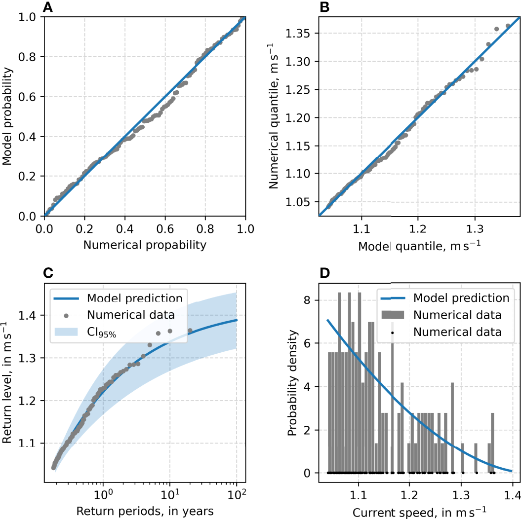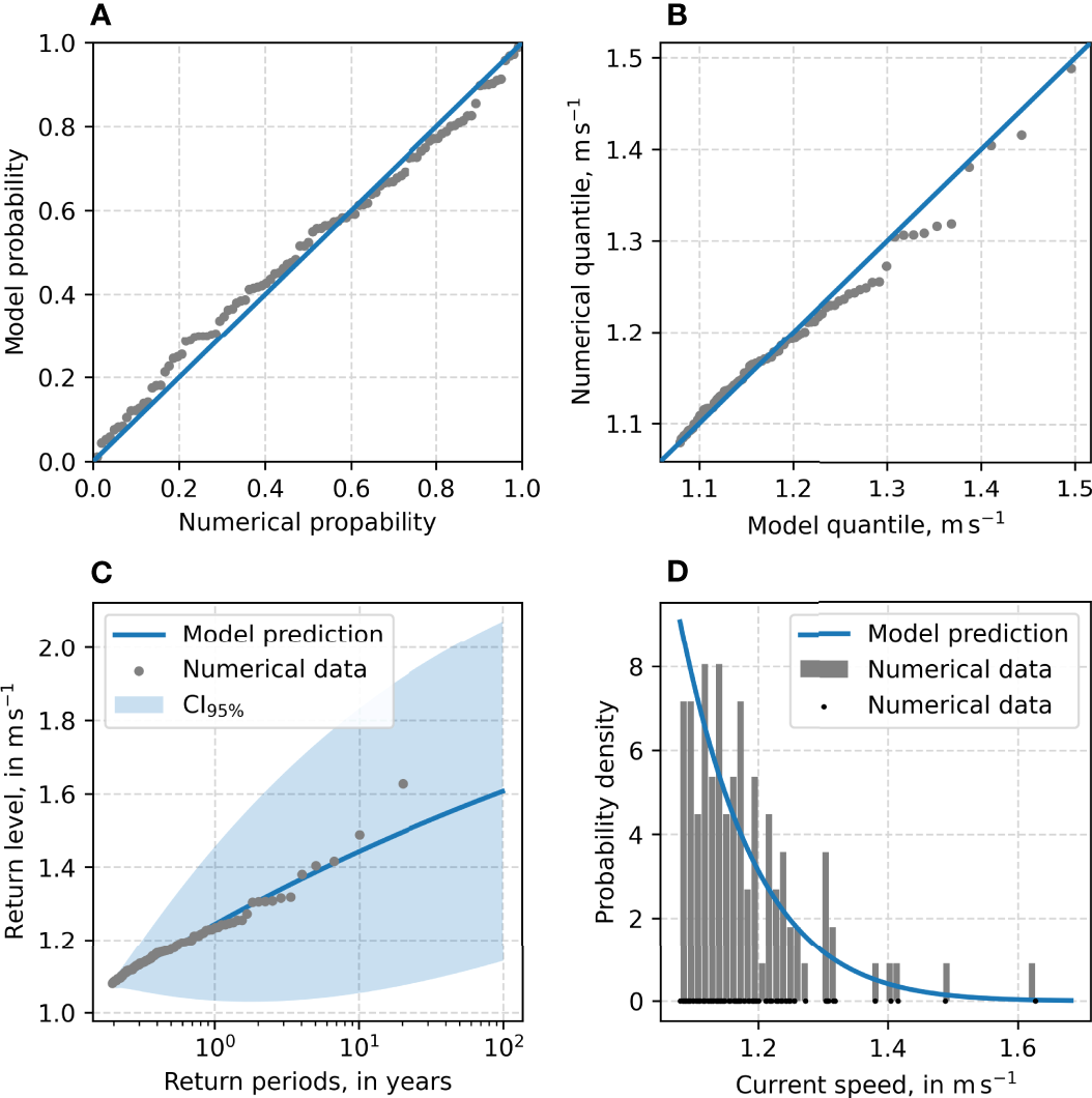 where u′m is the adjusted current speed. The adjusted numerical data reflect the empirical data much better. The effect of the model adjustment is strongly reflected by the mean relative error, that is reduced from −0.255 to 0.006. The mean absolute relative error of 0.288 and the root mean squared relative error of 0.365 are reduced to 0.153 and 0.206, respectively. Of greater concern, however, is the missing tail of the probability distribution of both numerical data in Figurs 2A, as these are of great importance for EVAs. Especially in the adjusted data, this leads to a pronounced underestimation of higher current speeds (i.e., rare events) as seen in the deviation from the diagonal in Figure 2B.