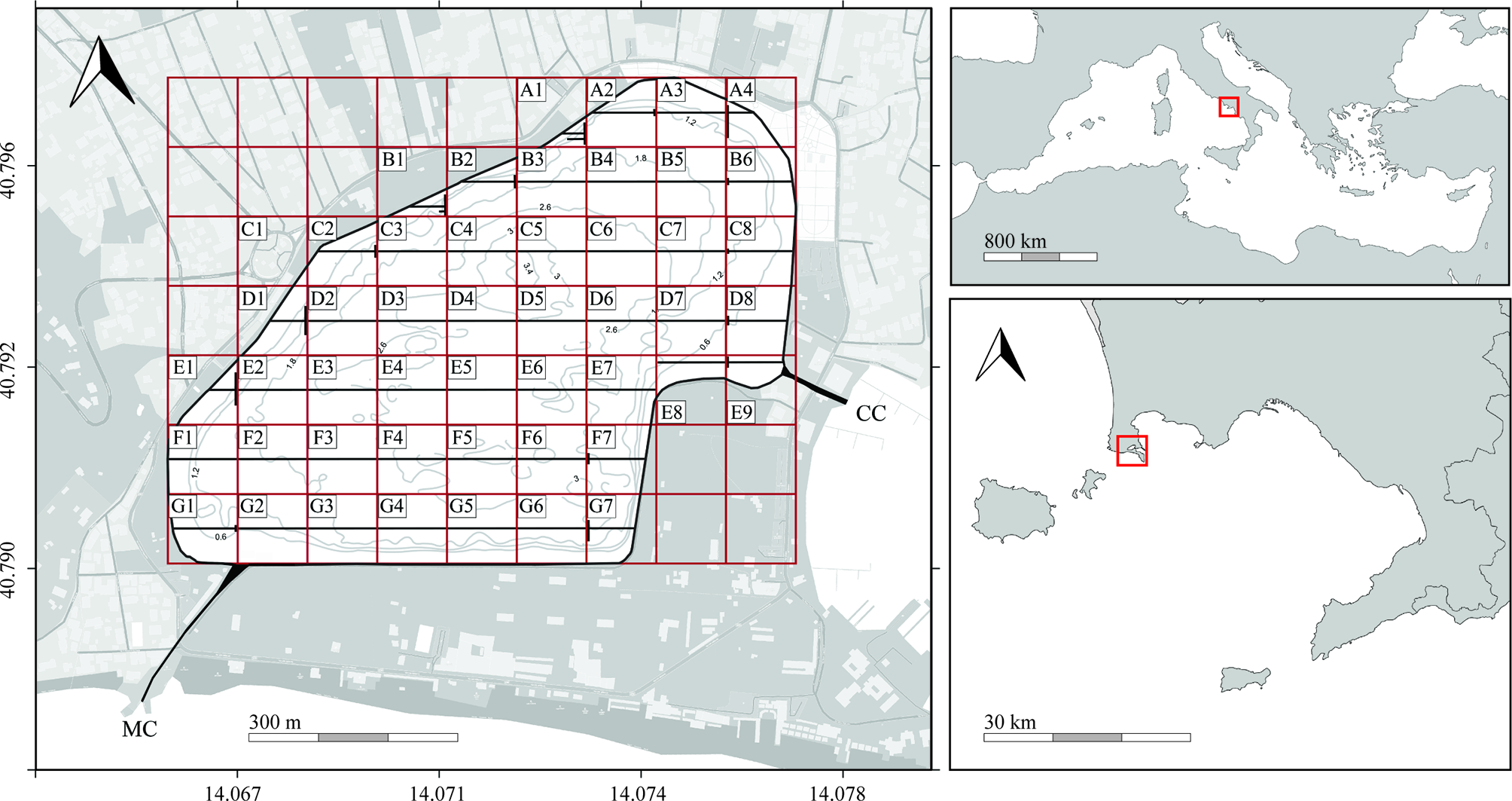 The Miseno Lake and its position (red square) in the Mediterranean Sea (top right) and in the Gulf of Naples (bottom right). Left image highlighting sampling grid (red squares), longitudinal transects (black lines), dock wall perimeter, channels (CC, Casevecchie channel; MC, Miliscola channel), and simplified bathymetry (for a detailed bathymetric map see Supplementary Figure 1).
