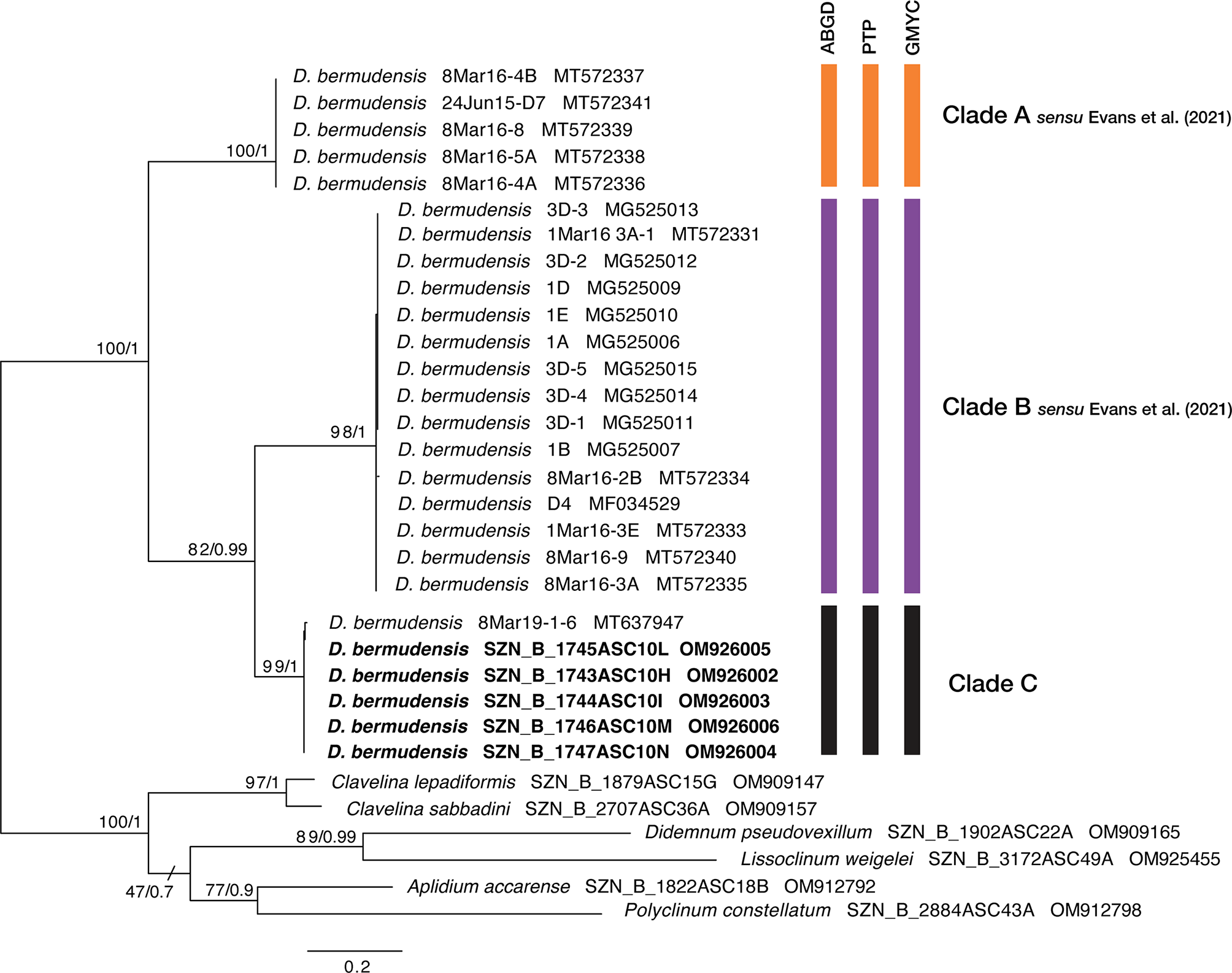A total of thirty-two COI partial sequences were used in the final alignment, including the five sequences of D. bermudensis amplified in this study and twenty-one sequences of D. bermudensis retrieved from GenBank (accession numbers reported in Supplementary Tables 1, 2). Six additional representatives of the order Aplousobranchia Lahille, 1886, collected in this study, were used as outgroup: Clavelina lepadiformis (Müller, 1776) (SZN_B_1879ASC15G), Clavelina sabbadini Brunetti, 1987 (SZN_B_2707ASC36A), Didemnum pseudovexillum Turon & Viard, 2020 (SZN_B_1902ASC22A), Lissoclinum weigelei Lafargue, 1968 (SZN_B_3172ASC49A), Aplidium accarense (Millar, 1953) (SZN_B_1822ASC18B), and Polyclinum constellatum Savigny, 1816 (SZN_B_2884ASC43A). The selected sequences were aligned and trimmed with Unipro UGene v.39 (Okonechnikov et al., 2012), and the best-fit evolutionary model (GTR + I + G) was found with JModelTest 2 v.0.1.10 (Darriba et al., 2012), selected with the Akaike information criterion (AIC) method. The maximum likelihood (ML) analyses were run with RAxML v.8.2 (Stamatakis, 2014) using 1000 rapid bootstrap pseudo-replicates. The Bayesian Inference (BI) was performed with MrBayes v.3.2.5 (Ronquist et al., 2012) run for 10 million generations, sampled every 1000 generations, with a standard 25% burn-in. Convergence of the MCMC runs was checked with Tracer v1.7.1 (Rambaut et al., 2018).