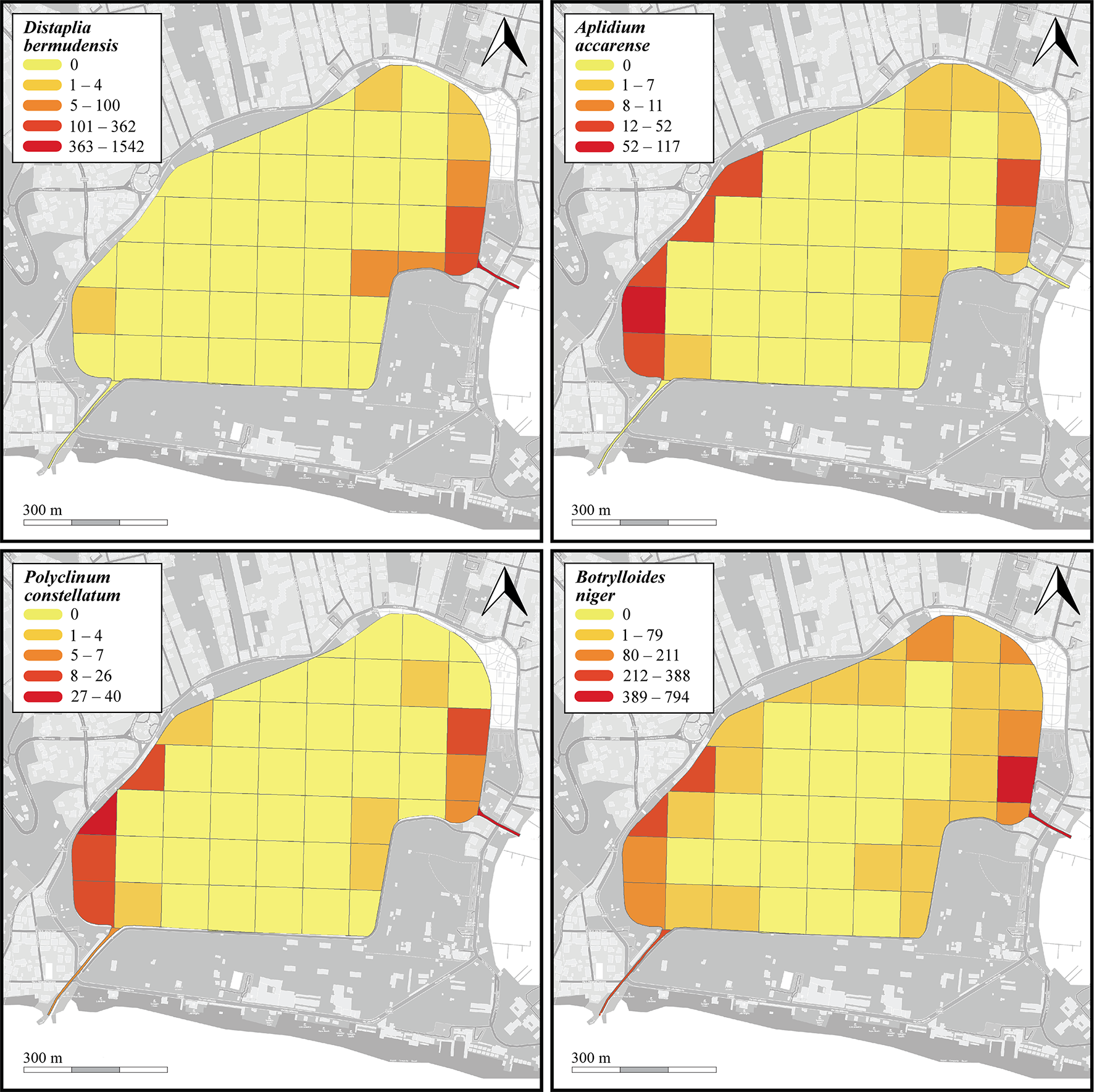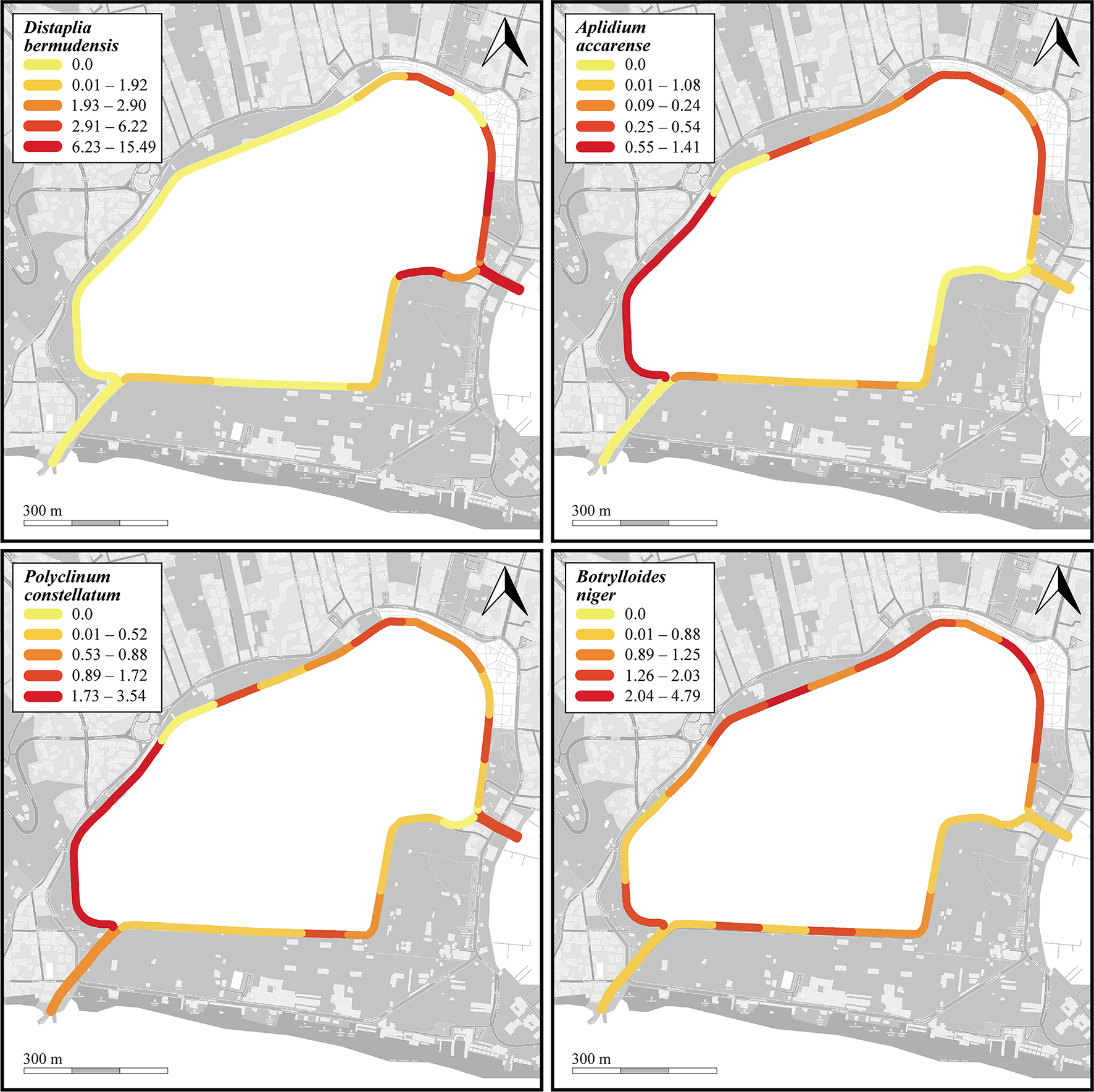 The abundance (number of individuals per transect) of the most commonly encountered NIS ascidians, namely Botrylloides niger Herdman, 1886, D. bermudensis, P. constellatum, and A. accarense, as well as of all NIS and cryptogenic species combined together, was modeled with Generalized Additive Models (GAMs; Hastie and Tibshirani, 1990). Due to severe overdispersion (residual deviance of the fitted models much higher than the residual degrees of freedom), and thus violation of the assumption of equal mean and variance in the response variables, the negative binomial distribution was used instead of the Poisson distribution (Lindén and Mäntyniemi, 2011). The expected values of the number of individuals counted in each transect were related to spatial and environmental covariates, according to the general formulation f(E[counts]) = LPi = c + Σmsm (zmi) + ΣrFri, where f is the link function (in this case link=log), LP is the linear predictor, sm(·) is the one-dimensional smooth function for covariate m, Fr are categorical predictors, and zmi is the value of spatial covariate m for the ith transect. The smooth function sm(·) was represented using penalized regression splines (cubic splines with basis dimension q=10), estimated by penalized iterative least squares (Wood, 2006). The optimum degree of smoothing was defined by generalized cross validation (GCV), where the amount that the effective degree of freedom of each model counts in the GCV score was increased by a factor c=1.4 according to Kim and Gu (2004) to avoid occasional overfitting. The mgcv package implemented in R v4.1.0 was used for model fitting (Wood, 2006; R Core Team, 2021).