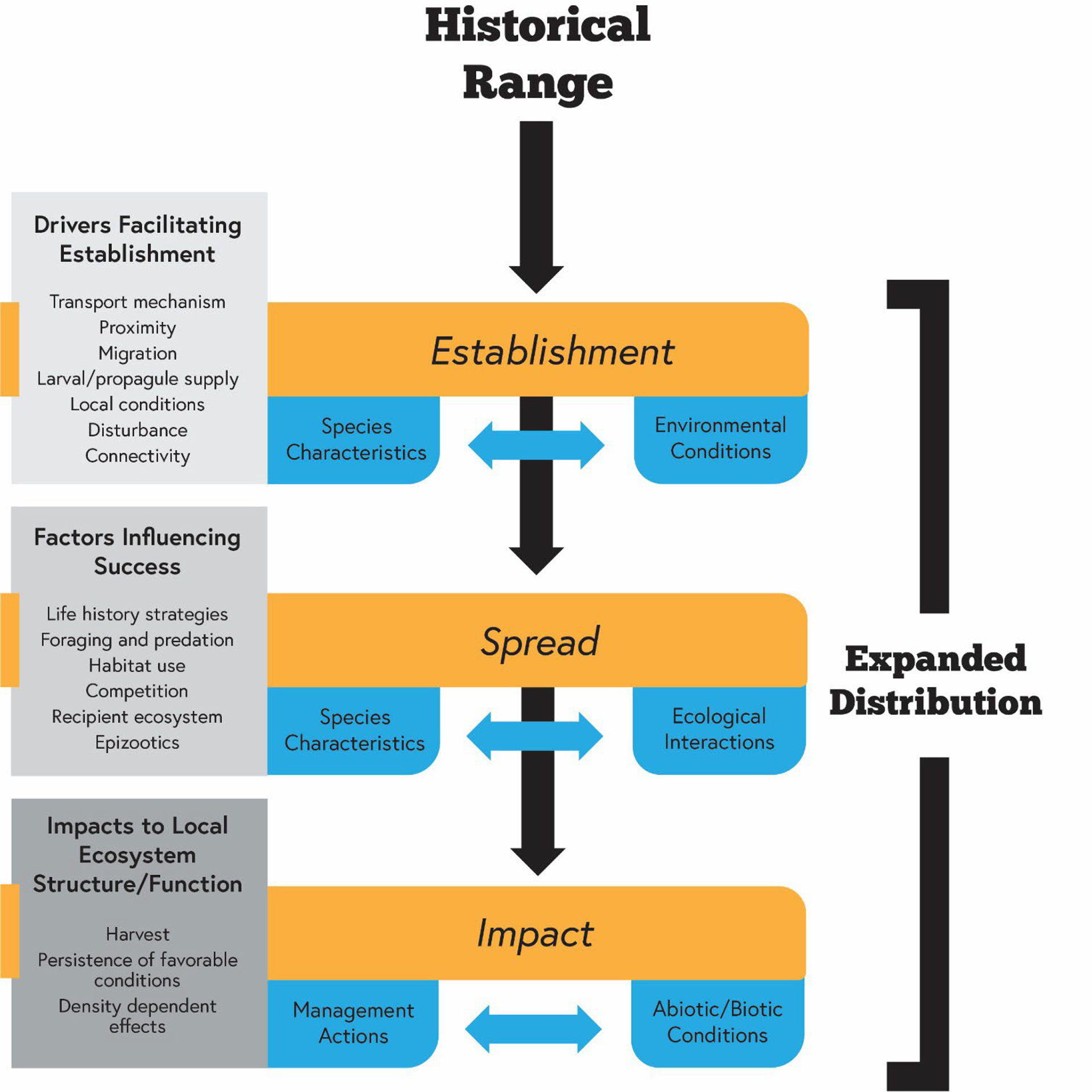 Losses of biological diversity continue to be driven by the effects of multiple historical stressors, chief among these is the introduction (intentional or accidental) of invasive species into areas outside their historical geographic ranges (also known as exotic species and/or nonnative species). As with invasive species, historical reductions of endemic biodiversity may facilitate the poleward expansion of warm-water organisms no longer limited by thermal barriers. In each case, this should lead to the mixing of the endemic species assemblages (“Wallace’s Realm’s,” Elton, 1958) with new species for which no evolutionary history exists. This lack of a shared history between invasive and endemic species is hypothesized to negatively impact native species.