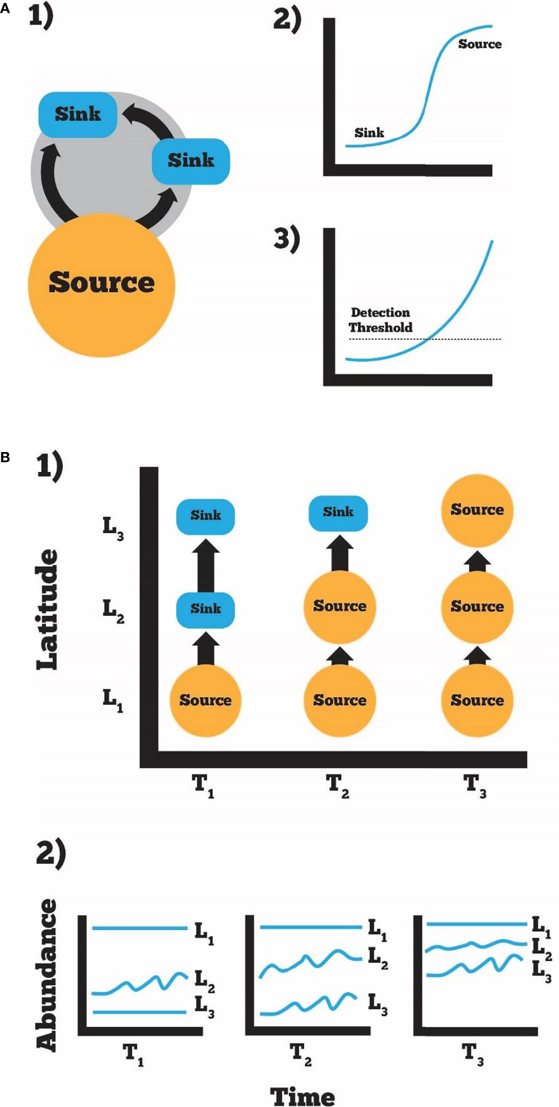 Source-sink metacommunity ecology can inform the spread of warmer water species into areas not previously tolerable (Lockwood et al., 2013). We predict that early in the process, source populations may exist that fuel sinks during short-term, favorable conditions (A, 1) and as temperatures continue to warm over time these sinks become sources (A, 2). Novel organisms will be below a detectable threshold for many gear types and monitoring strategies early and as abundance increases become more detectable (A, 3). Latitudinal abundance (L) will also change over time (T), as conditions change there will be less occurrences below a species thermal tolerance and sinks become source populations (B, 1). In this way, we predict abundance will increase over time and species can move poleward in a stepwise fashion (B, 2).